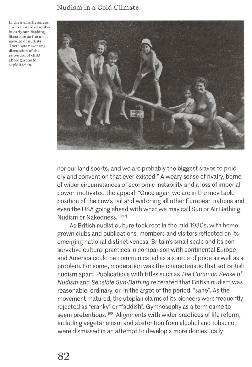 Der Band gliedert sich in drei Abschnitte und beginnt bei der Entstehung des Naturismus in Großbritannien in den 1920er Jahren. Diese aufkeimende Kultur breitete sich in der Nachkriegszeit aus, mit einer wachsenden Zahl von Clubs, auflagenstarken Publikationen und Fotografen, die sich der Zensur widersetzten.