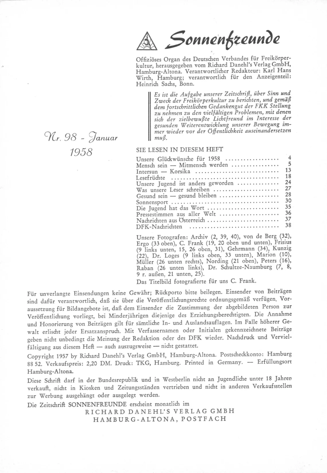 SonnenfreundeOffiziöses Organ des Deutschen Verbandes für Freikörperkultur Heft 98 • Januar 1958 |