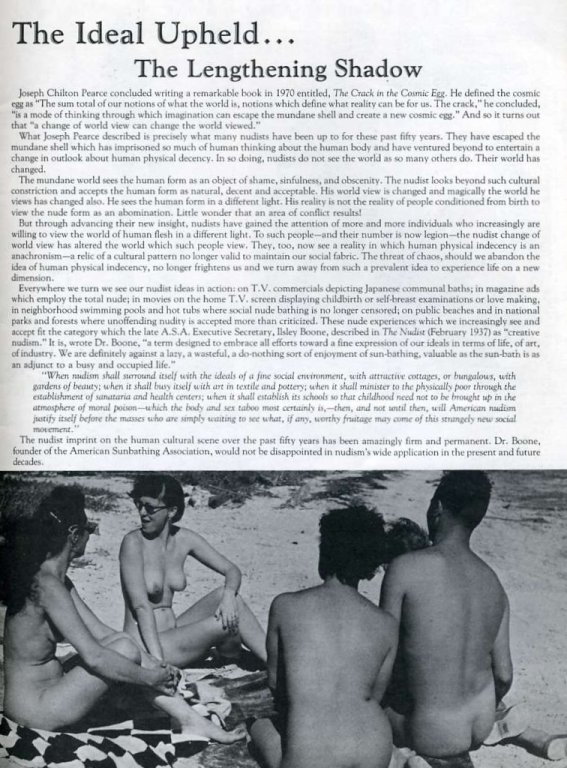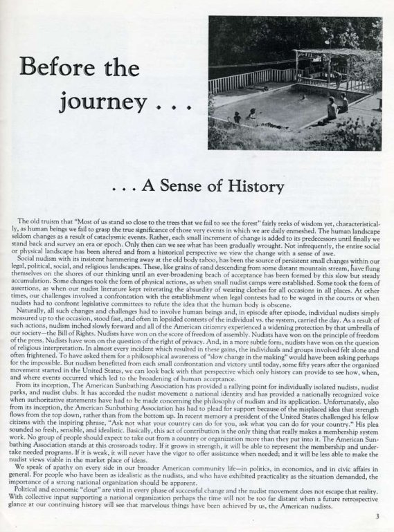| 50 Jahre Naturismus in den USA Dieses Sonderheft, herausgegeben im Januar 1981 von der American Nudist Research Library (ANRL), zeigt die Entwicklung des Naturismus in den USA. Alle Präsidenten und die großen Resorts werden ausführlich vorgestellt. Zahlreiche Bilder zeigen die Aktivitäten in den Vereinen. |