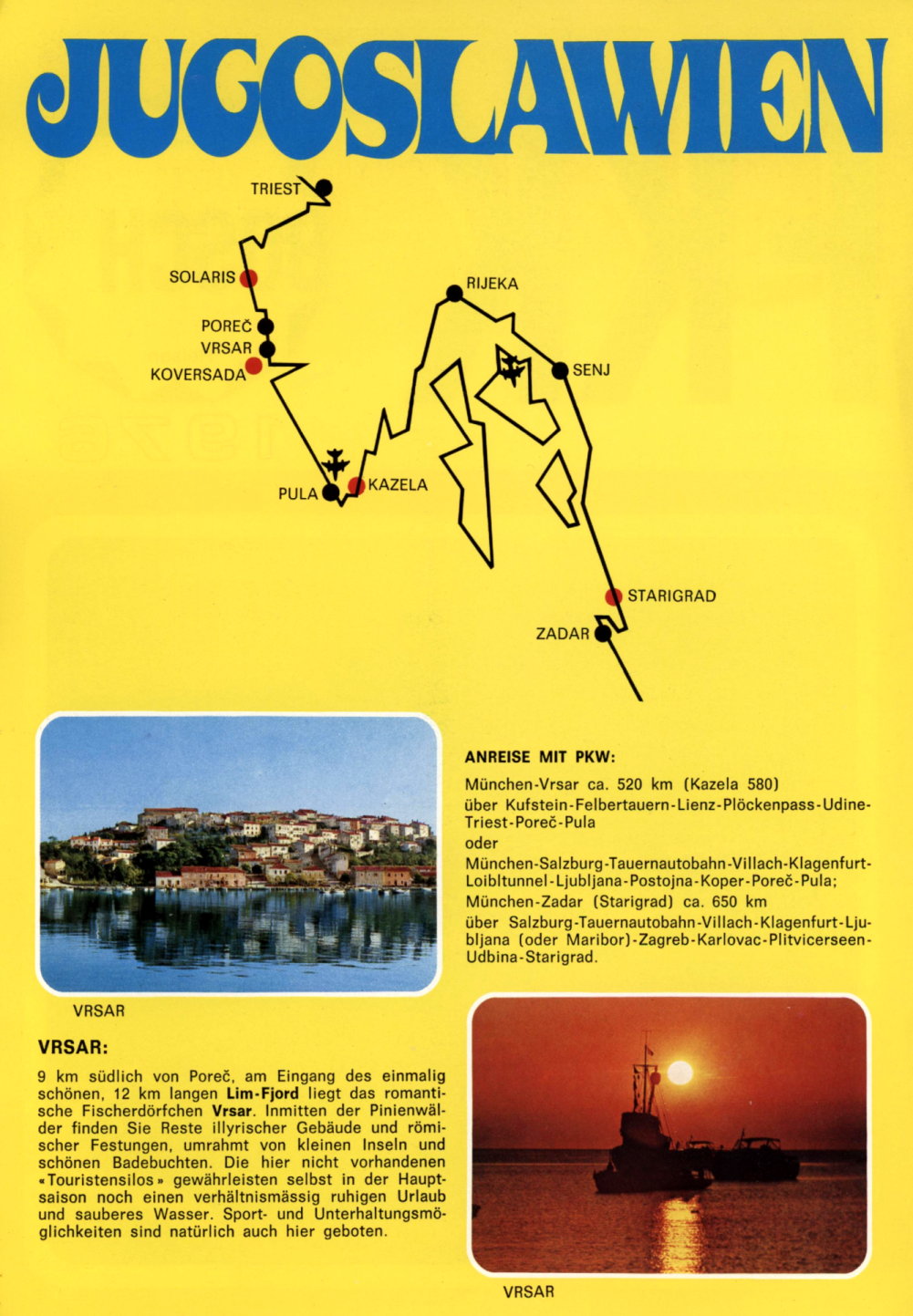 Bosch-Reisen 1976Format: DIN A4Seiten: 8Gegründet 1970 von Walter Bosch, beschränkten sich die Angebote ausschließlich auf Reiseziele an der kroatischen Küste (damals Jugoslawien). Aktualisierungen: • 03.09.2024 → Seite erstellt