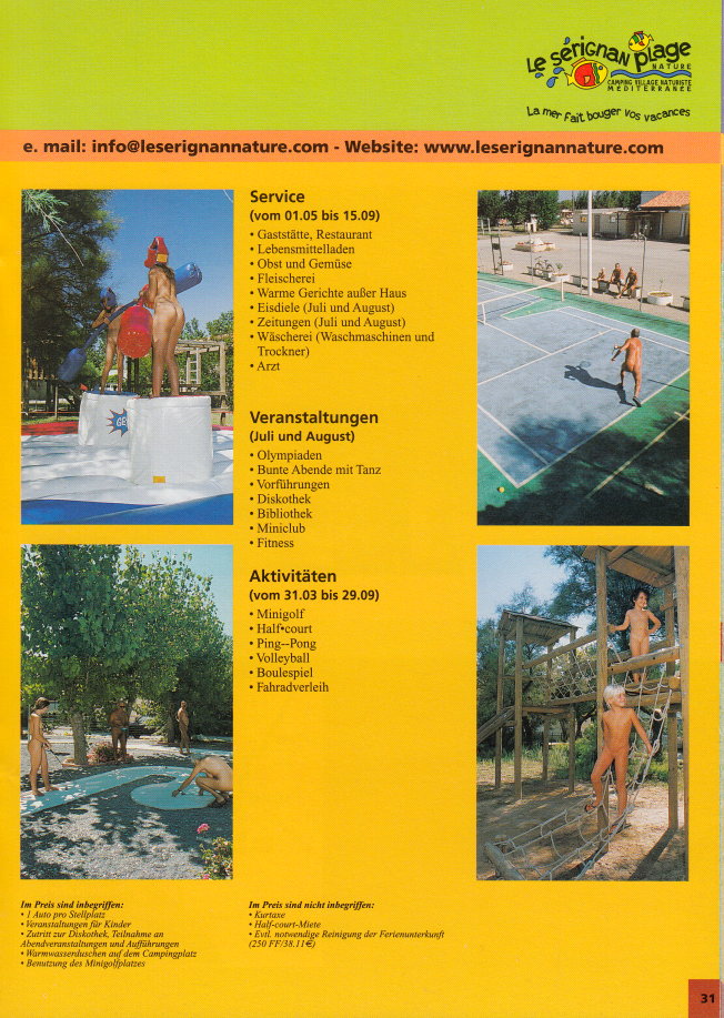 Dieser Katalog beginnt mit allgemeinen Themen zu den verschiedenen Anlagen und hebt den Naturismus im speziellen hervor. Im zweiten Teil werden die einzelnen Anlagen im Detail vorgestellt, mit Grundrissen der Bungalows und den enstsprechenden Preisen.