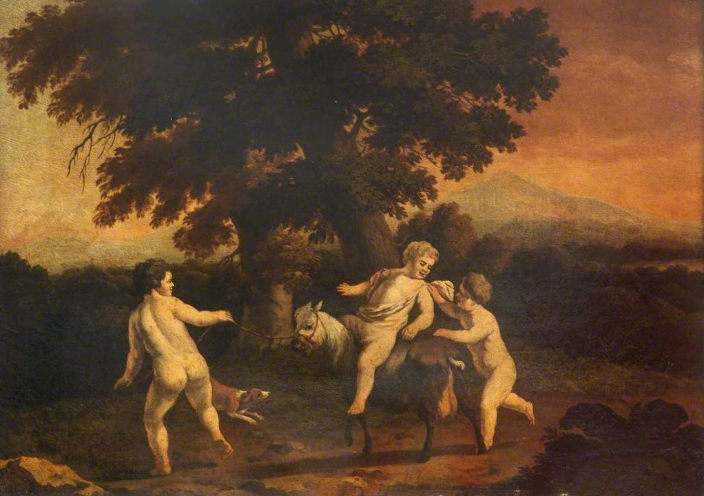 Landschaft mit drei nackten Jungen, die auf einer Ziege reiten