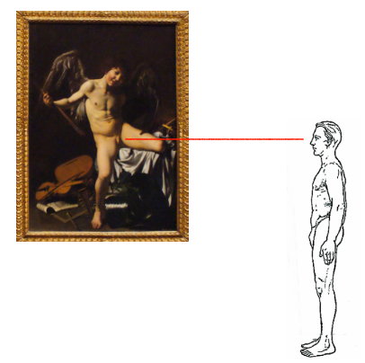 Für dieses Werk soll Caravaggio sein Diener und Gehilfe Francesco Boneri als Modell gestanden haben, was jedoch nicht eindeutig gesichert ist. Im Gegensatz zu zahlreichen anderen Darstellungen sind bei diesem Werk die Flügel recht dunkel gehalten, sie verschmelzen beinahe mit dem Hintergrund, werden dadurch fast belanglos und dienen mehr einer Alibi-Funktion zur eigentlichen Abbildung eines nackten Knaben.