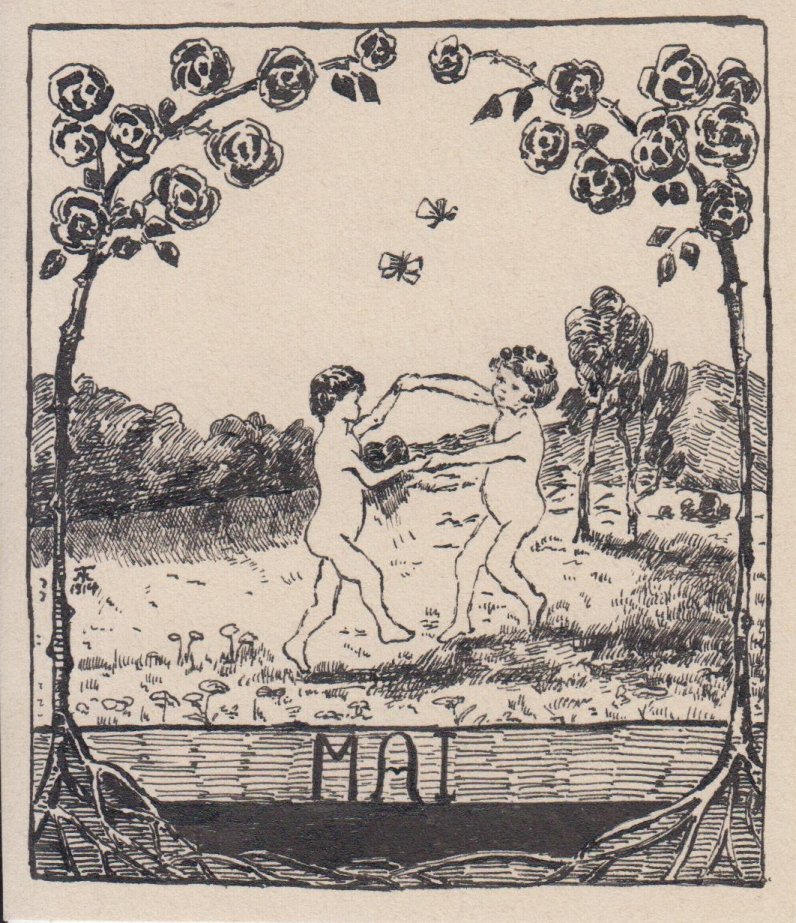„Kinder-Reigen” Original-Lithographie aus dem Jahr 1914 zu einer dem »Wonnemonat« Mai gewidmeten Textur - im Bestand des FKK-Museums. Signatur und Datierung etwas „versteckt„ |