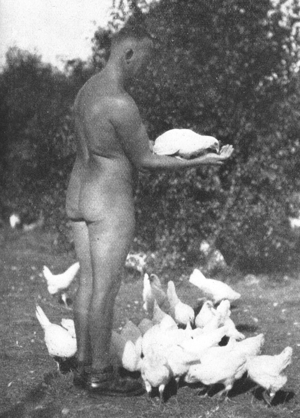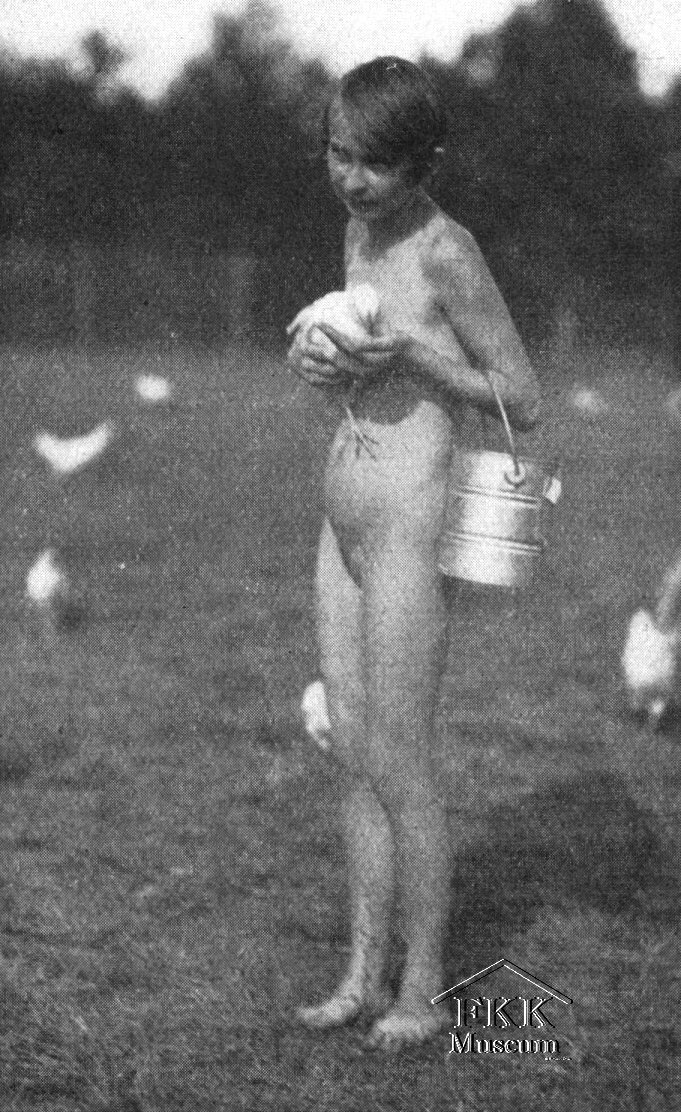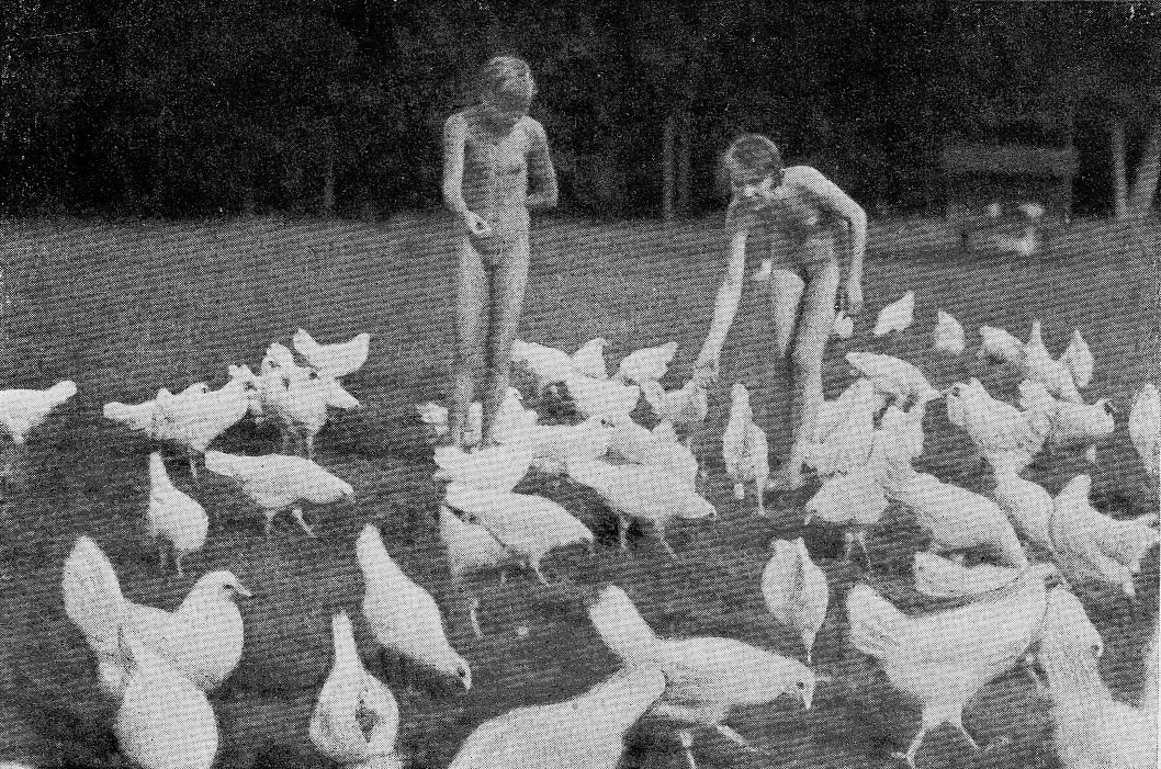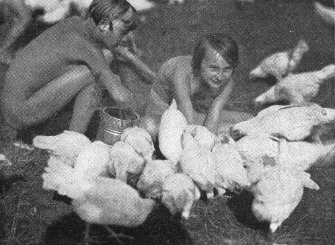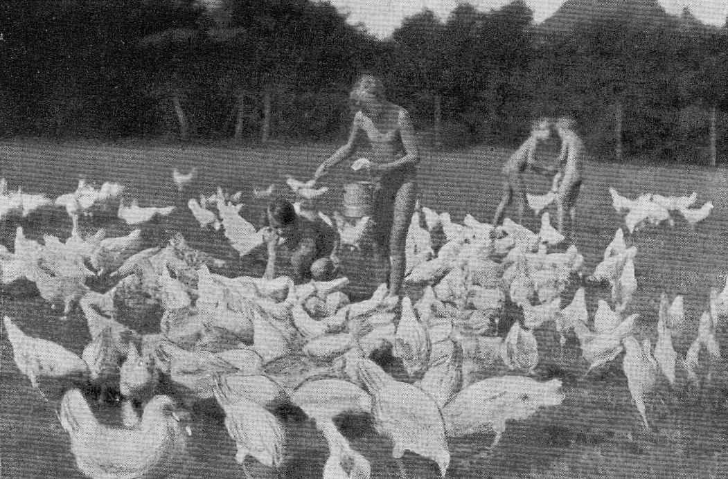 Oberaufsicht hatte der „Hühnervater”, der - wie hier - ausschließlich für die Hühner verantwortlich war und diese zusammen mit den Kindern versorgte und umhegte. Die Kinder lernten dabei nicht nur den veranwortungsvollen Umgang mit Tieren, sondern auch, dass deren Leben als so genannte „Nutztiere” nur sehr begrenzt war.