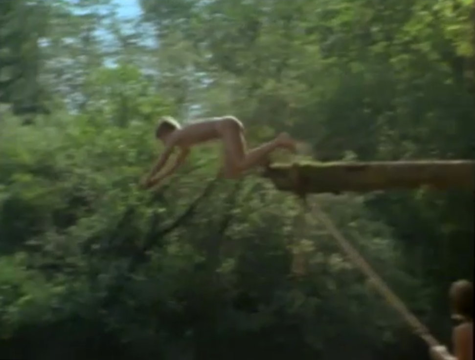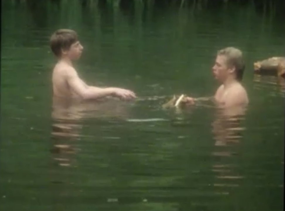 Bei den zahlreichen Abenteuern, die Huckleberry Finn (Ian Tracey) und Tom Sawyer (Sam Snyders) erleben, muss auch einmal eine kurze Entspannung sein. Da bietet sich ein Bad im See dann durchaus an.