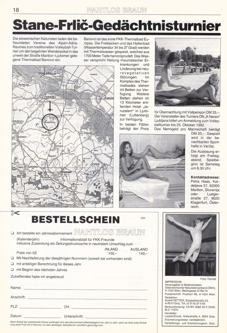 NAHTLOS BRAUNInformationsblatt für FKK-FreundeOffizielles Organ des Österreichischen Naturistenverbandes (ÖNV) Ausgabe 147 Nr. 3 • September 1992 |