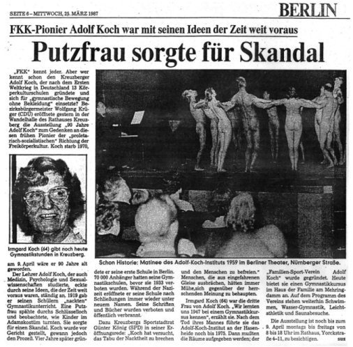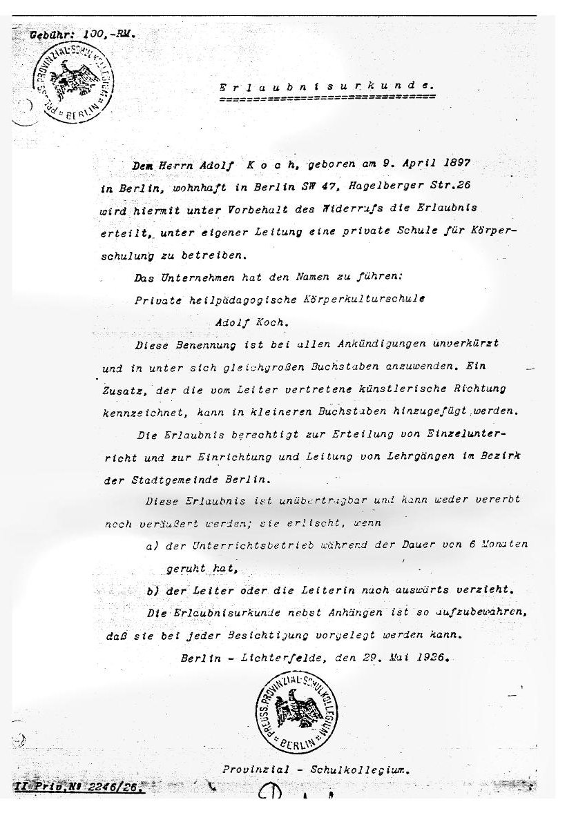 1923 beendet Adolf Koch seine Gymnastiklehrerausbildung. An der Kreuzberger Schule führte er die von ihm entwickelte Gymnastik aber nicht ein. Bei Klassenausflügen kam es schon mal dazu, dass man in abgelegenen Seen nackte badete, mehr jedoch nicht.