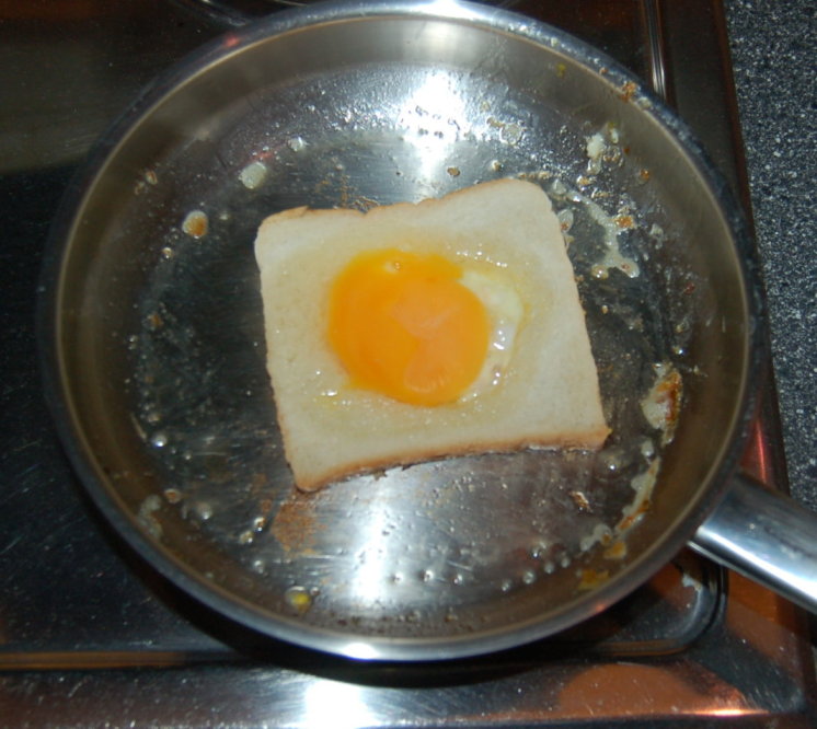 Zuerst wird in das Toastbrot ein Loch von ca. 4 bis 5 cm geschnitten und dieses dann ganz kurz von beiden Seiten in einer leicht gefetteten Pfanne angebraten. Dann ein rohes Ei aufschlagen und in das Loch der Toastscheibe geben. Durch Wenden beidseitig festbraten, etwas salzen - fertig !