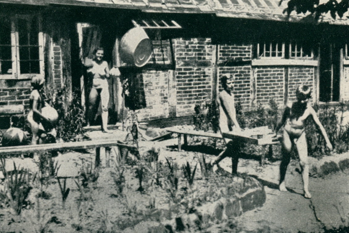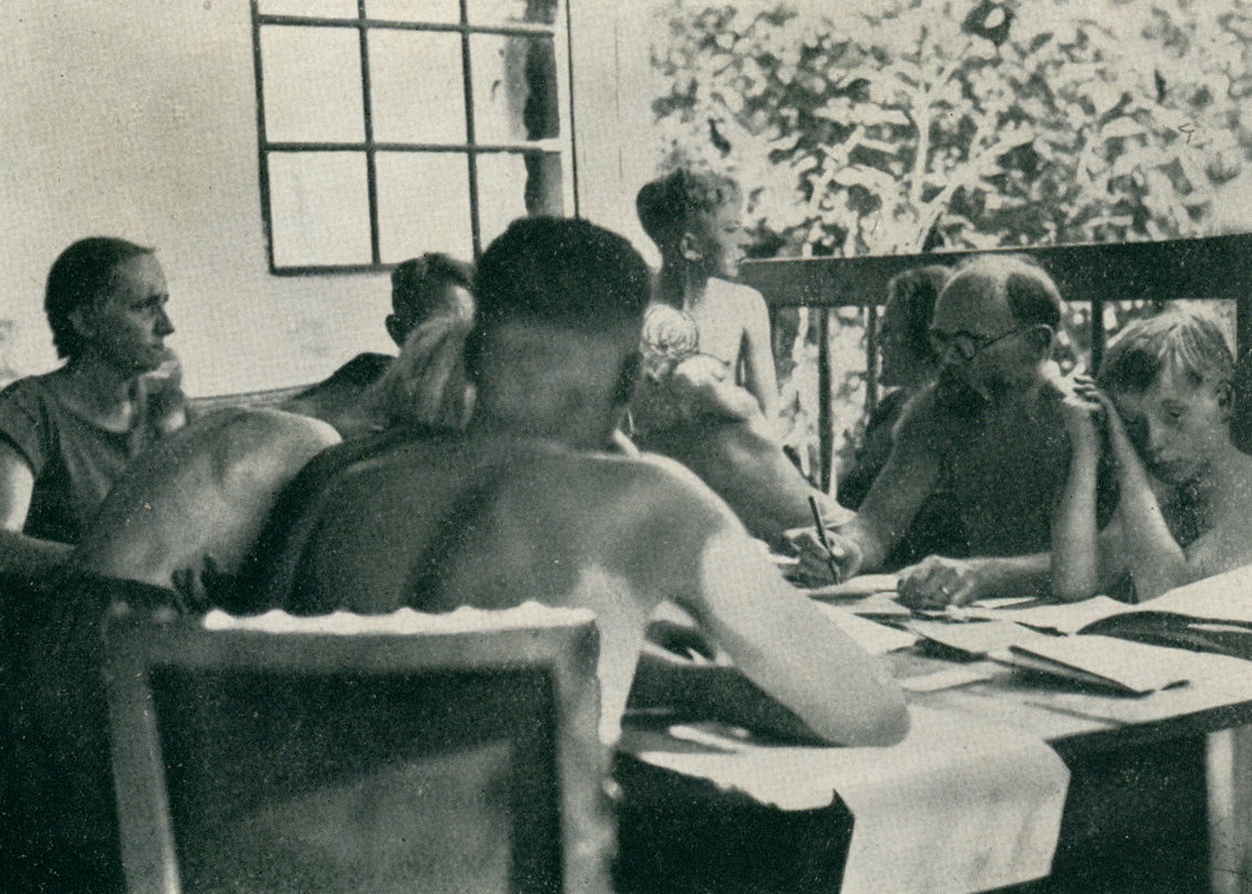 ... Bald hatte ich mich in der Schule eingelebt und fühlte mich da auch am richtigen Platz - die Kost war vegetarisch, aber nach einer Weile fehlte einem nicht mehr die Wurst und das Fleisch. Das einzige Unangenehme war, daß morgens schon in aller Frühe der große indische Gong ertönte und man frisch aus dem Bett zum Morgenlauf zu erscheinen hatte. Wir liefen natürlich im Adams-Kostüm ... Obwohl wir zuerst noch bei ein paar Häusern vorbei liefen, guckte schon keiner der Bewohner mehr, wenn wir »verrückten« Nackten da rumtobten. Wir hatten anscheinend Narrenfreiheit. Überhaupt war der sonstige Kontakt zur Dorfbevölkerung sehr gut. Oft waren wir mit ihnen gemeinsam in irgend einem der Häuser, während die Frauen spannen, sangen wir gemeinsam und es wurde auch vorgelesen und Geschichten erzählt. ... Wir wurden völlig natürlich erzogen und ich möchte sagen, daß dieses eine wirkliche Schule für das spätere Leben war.