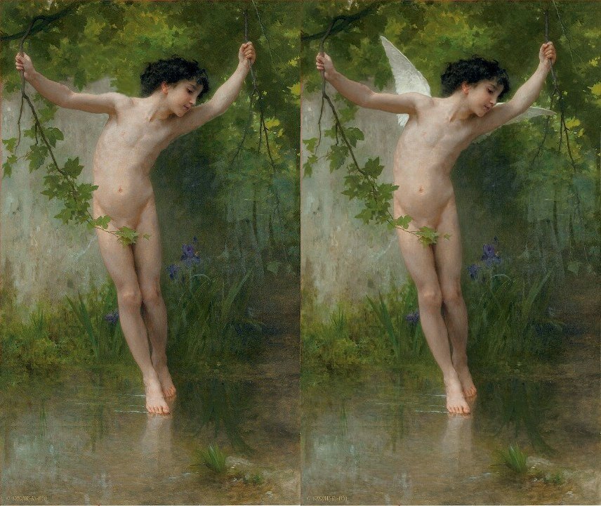 | Ein Engel ? Ein nackter Junge ? Die Grenzen sind fließend. Beraubt man dem Amor seiner Flügel, so haben wir nur noch einen nackten Knaben, der an einem See steht.
