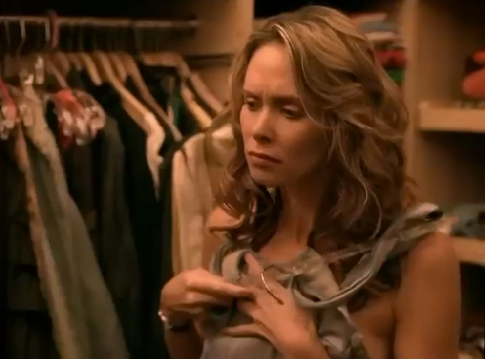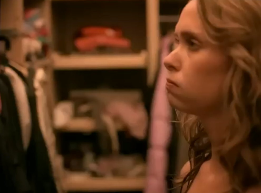 Eine junge Frau, Gastgeberin einer Party, möchte sich noch umziehen und steht unschlüssig vor ihrem Kleiderschrank. Nachdem sie bereits mehrere Kleider ausprobiert und kein passendes Outfit gefunden hat, entschließt sich sich letztendlich dazu, einfach nackt auf ihre Party zu genhen.