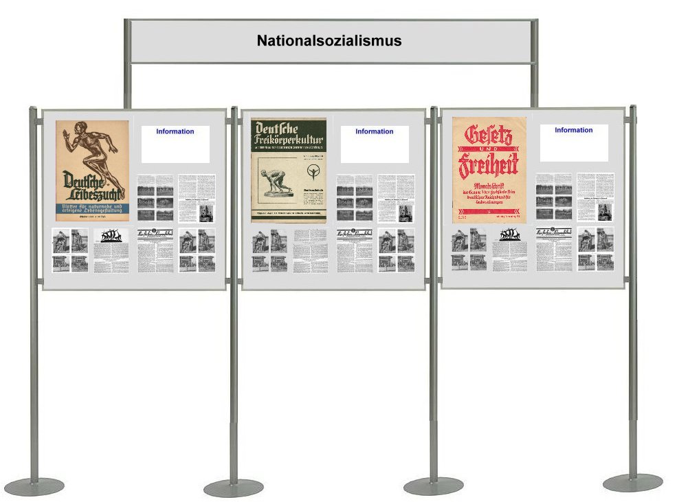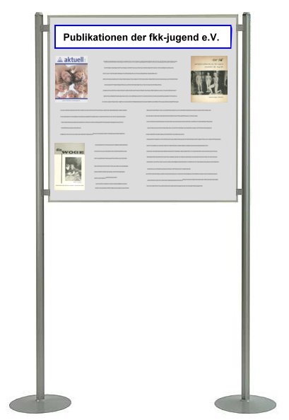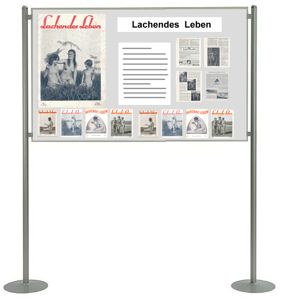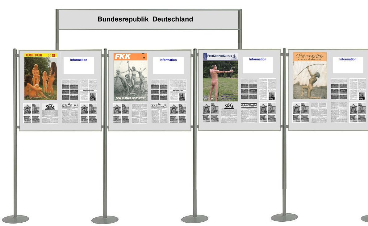 Text-TafelnTafeln, welche vorbehaltlich nur für Texte vorgesehen sind, wird es auch geben. In der Planung sind zur Zeit drei Tafeln: Tafel 1 Grundsätzliches zu den FKK-Publikationen und eine allgemeine Einleitung zur Ausstellung. Tafel 2 Das „Schmutz- und Schundgesetz” und seine Auswirkungen auf die Hefte der Freikörperkultur. Tafel 3 „Kommerzielle” und „nicht-kommerzielle” FKK-Hefte - Hefte für die Freikörperkultur zwischen »Geldmacherei« und »Informationen für wirklich Interessierte«. |