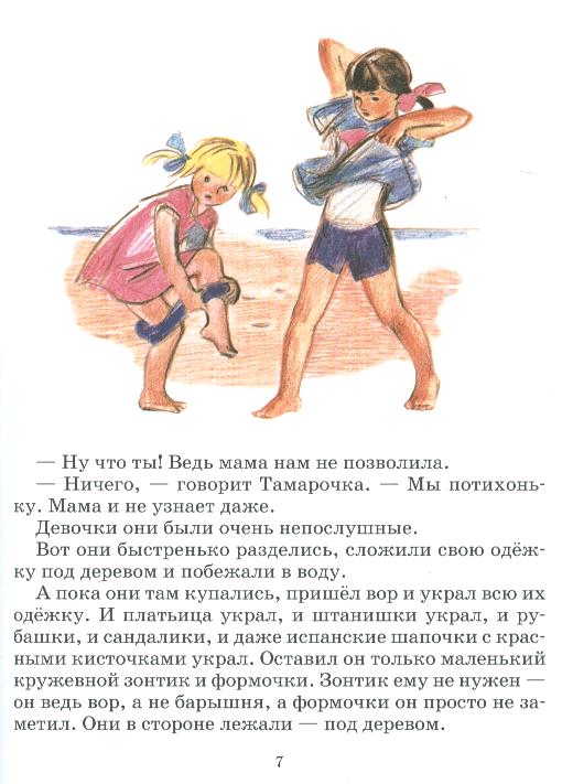 In der ersten Erzählung »am Meer« gehen die beiden Schwestern, obwohl von ihrer Mutter verboten, an den Strand. Sie ziehen sich aus, laufen ins Wasser. Während die beiden Mädchen im Meer planschen, stiehlt ein Dieb ihre ganze Kleidung. Nackt, wie sie sind, treten sie also ihren Heimweg an. Unterwegs berichten sie einem Polizisten vom Diebstahl ihrer Kleidung.