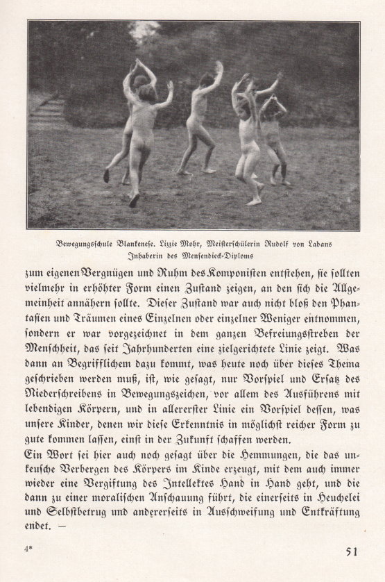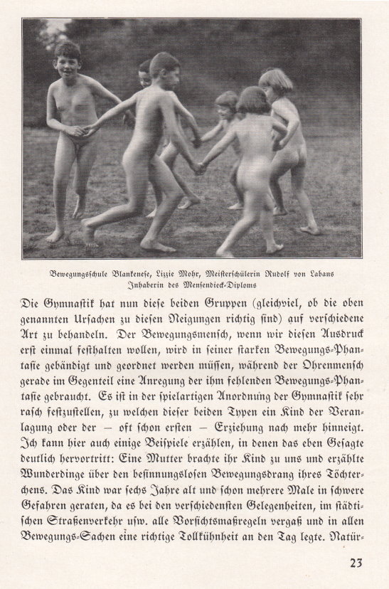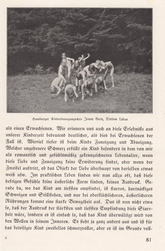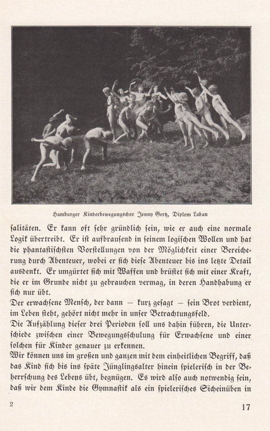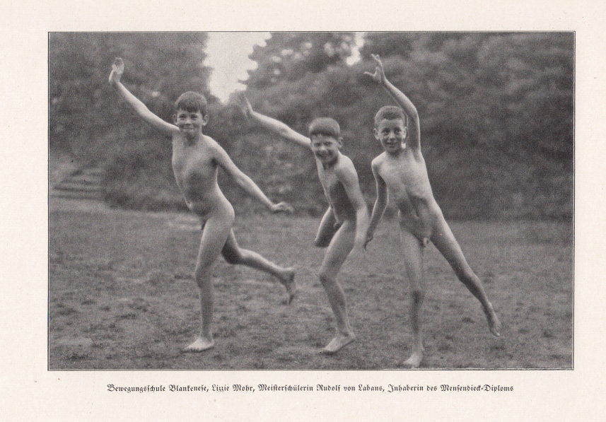 » Des Kindes Gymnastik und Tanz « - Rudolf von Laban, selbst ein sehr bekannter Tänzer engagierte sich stark für die künstlerische Erziehung und Entwicklung der Kinder - gemäß seines eigenen künstlerischen Fachgebietes, dem Ausdruckstanz. Bei dieser Arbeit förderte er die Phantasie, den Spieltrieb und die Unbekümmertheit der Kinder für den (nackten) Ausdruckstanz.