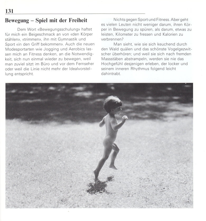 | Interessant und sehr nachahmenswert sind vorallem die Spiele zur Sinnes- und Körperwahrnehmung. Hierbei dient uns unsere Haut als wichtigstes Sinnesorgan. Viele, der in diesem Buch vorgestellten Übungen und Spiele, kann man sehr gut in die Freikörperkultur übertragen. Vielleicht auch eine gute Idee, einmal einen „Tag der Sinneswahrnehmung“ zu veranstalten. |