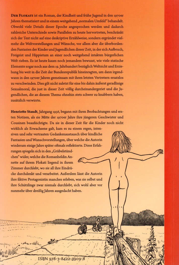 „Der Flokati” ist ein Jugendroman, ja fast ist man geneigt zu sagen: ein Kindheitsroman, in dem die Nacktheit eine zentrale Rolle spielt. Aber nicht nur die Sache selbst, auch die daran zwangsläufig hängenden Fragen werden, aus kindlicher Sicht, recht genau beschrieben. Warum sind manche Kinder gerne nackt, andere aber nicht? Warum findet man es spannend, heimlich nackt herumzulaufen? Warum fürchtet man sich davor, nackt entdeckt zu werden und wünscht sich dabei gleichzeitig heimlich genau dieses? Ist es eigentlich böse, seine Hausaufgaben daheim nackt auf dem Teppich liegend zu machen? Würden die Eltern schimpfen, wenn sie es wüssten, oder wäre es ihnen völlig egal? Und wie sieht nun eigentlich so ein Pimmel wirklich aus, von dem man als Mädchen zwar schon tausendmal gehört, aber noch nie etwas „in natura” gesehen hat? Solche und ähnliche Fragen stellen sich Kinder mehr oder weniger alle – sie stellen sie „sich”, nicht ihren Eltern, nicht ihren Lehrern, oftmals auch nicht ihren Freunden, weil sie mit dreizehn Jahren natürlich längst gemerkt haben, wie empfindlich, ja gereizt ihre Umgebung auf das Thema Nacktheit reagieren kann. Und wenn sie dann irgendwann durch das Leben beantwortet worden sind, dann geraten diese kindlichen Fragen wieder in Vergessenheit. Vielleicht kommen sie ja deshalb in den sonstigen so genannten „Jungenerinnerungen” auch nur so selten vor.