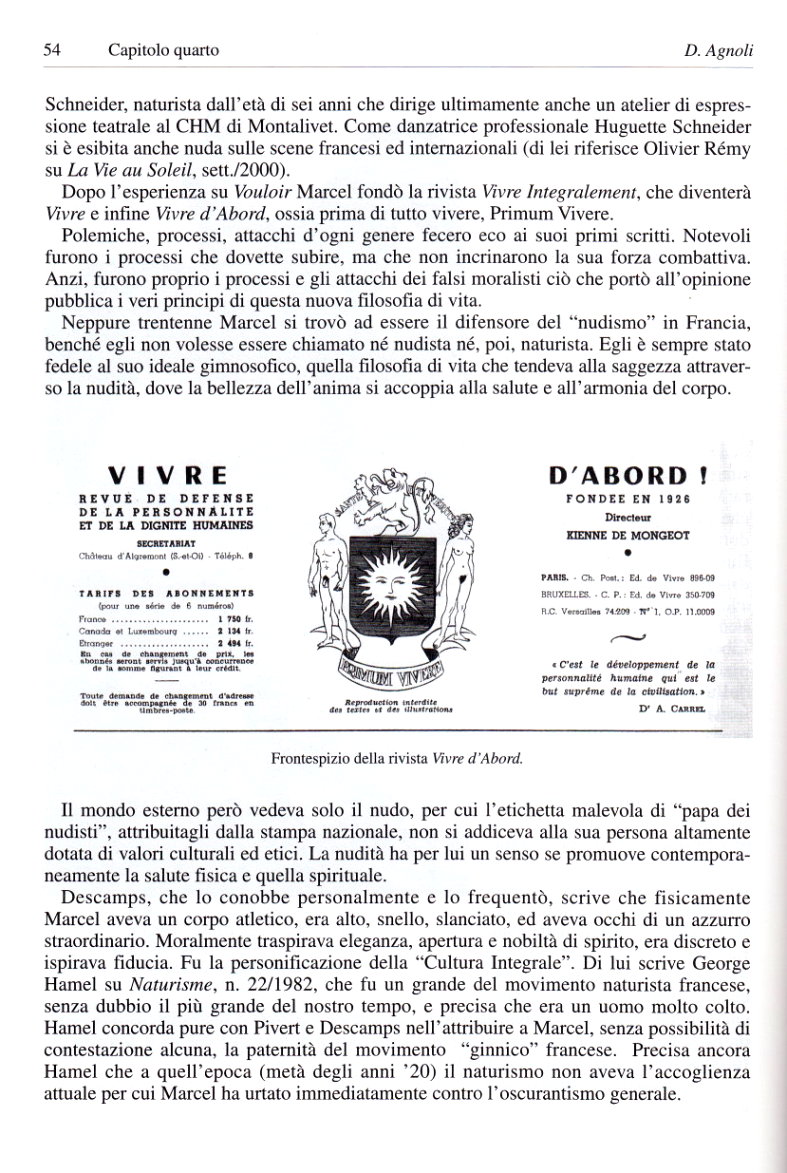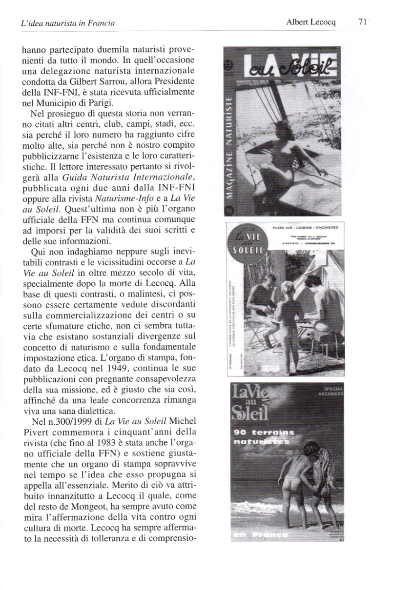 | Die Idee des Naturismus in Frankreich Sonderausgabe, herausgegeben von der „Federazione Naturista Italiana” (FENAIT) über die Geschichte der Freikörperkultur in Frankreich. Erwähnenswert ist, dass in diesem Buch ganz besonders auf die Frauen (→ Donne) im Naturismus eingangen wird (u.a.: Christiane Lecocq, Jeanine Dumont, Germaine Cardin,...). |