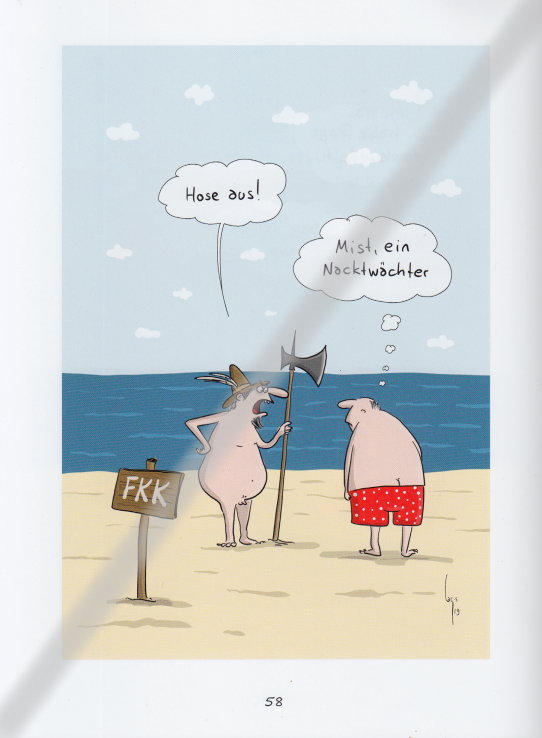 Mit gewandter Feder illustriert Mario Lars, warum Westdeutsche sich bald auch keine Badehosen mehr leisten können, in welchem Zusammenhang FKK und Solarenergie stehen oder was die Aufgabe einess Nacktwächters ist.