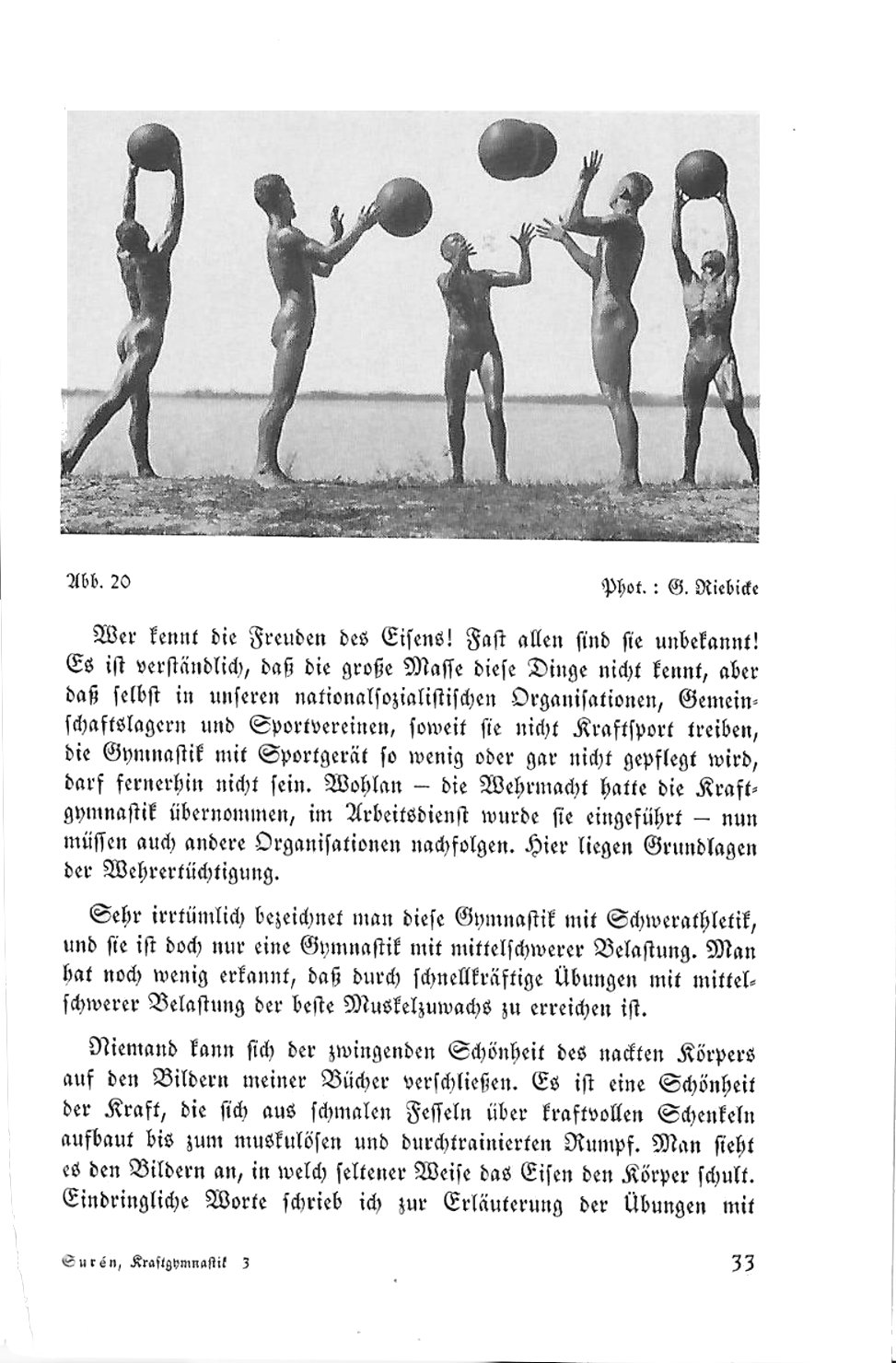 In diesem Buch beschreibt Hans Surén zunächst gymnastische Übungen, welche mit einfachen Sportgeräten wie dem Medizinball auskommen und den Beginn der eigentlichen Kraftübungen bilden.