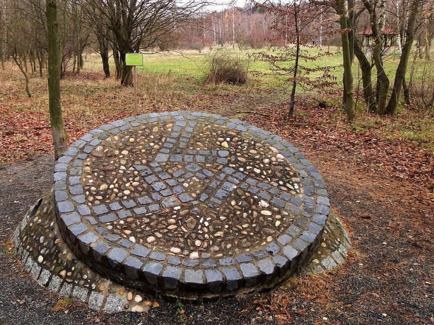 Das Symbol zeigt die Elemente: Wasser, Erde, Licht und Luft. Dieses Stein-Mosaik steht am Eingang zum ehemaligen Jungborn-Gelände im Eckertal bei Stapelburg.
