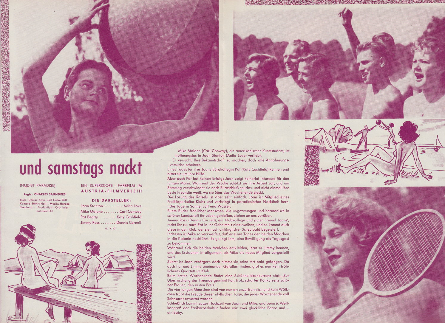 Unter dem Titel »Und Samstags nackt« kam dieser Film 1959 in die deutschen Kinos. 1960 wurde er unter Anlehnung an den Original-Titel in »Nudisten-Paradies« umbenannt - auch, weil dieser Titel dann etwas unverfänglicher klang.