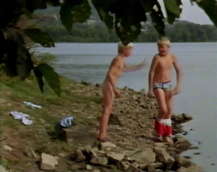 Endlich Sommer - endlich Ferien. Machen, was man will - so denken auch die beiden 10jährigen Jungen Trond (Øystein Offer-Olsen) und Øystein (Hans Jacob Melbye). Voreinander haben die beiden Jungen keine Probleme, ziehen sich aus (1), baden und veranstalten ein kleines Wett-Hochpinkeln (2). Allerdings werden Trond und Øystein von zwei Mädchen beobachtet, die dann noch so frech sind, ihre Klamotten hoch in einen Baum zu werfen. Verschämt (3) schleichen sie rückwärts aus dem Wasser und versuchen unter den Augen der lachenden Mädchen, ihre Sachen aus dem Baum zu holen (4).