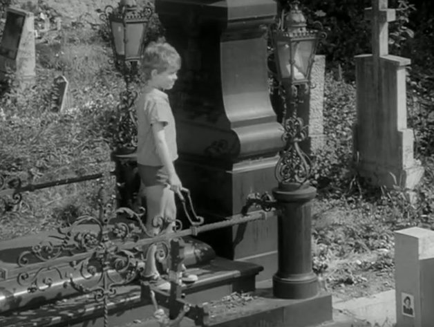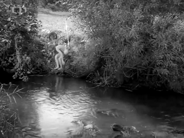 In den Fokus dieser Erzählung rücken nach und nach die spielerischen Abenteuer zweier Kinder, die zunächst auf einem Friedhof spielen, später eine Angel finden, um dann in einem Bach Fische zu fangen ...