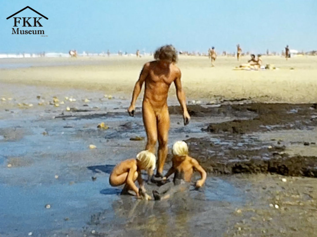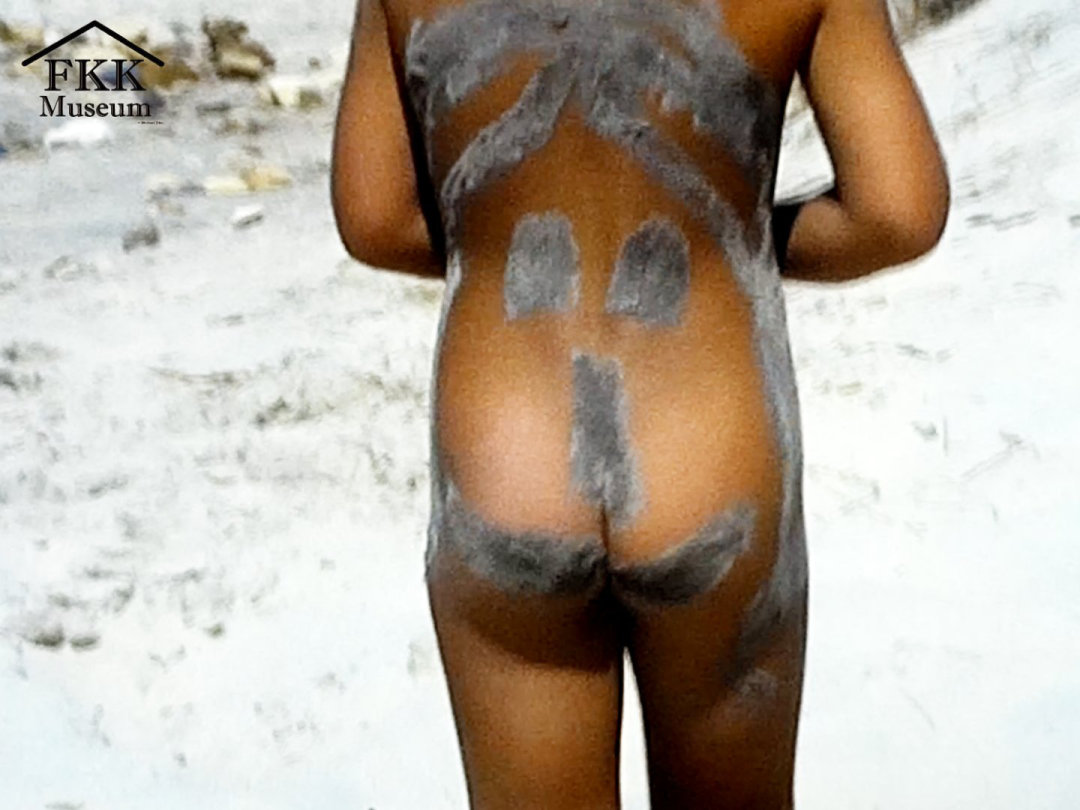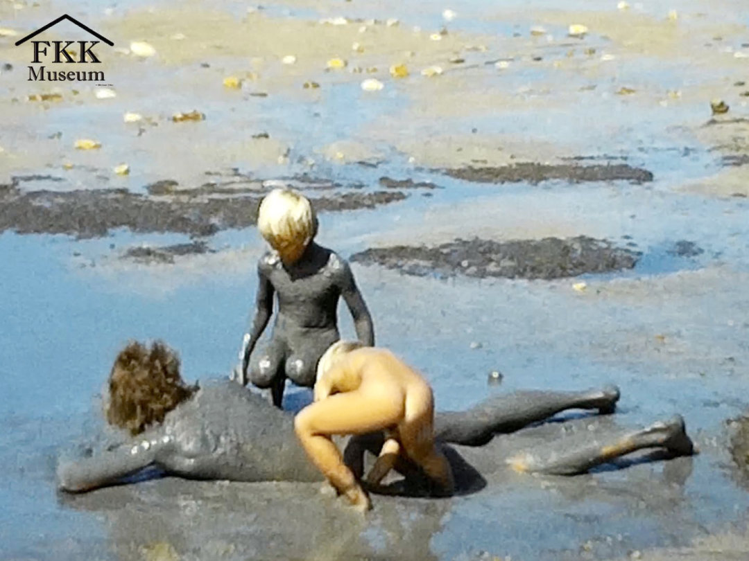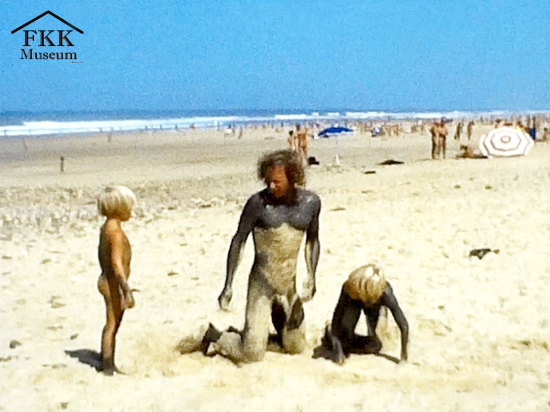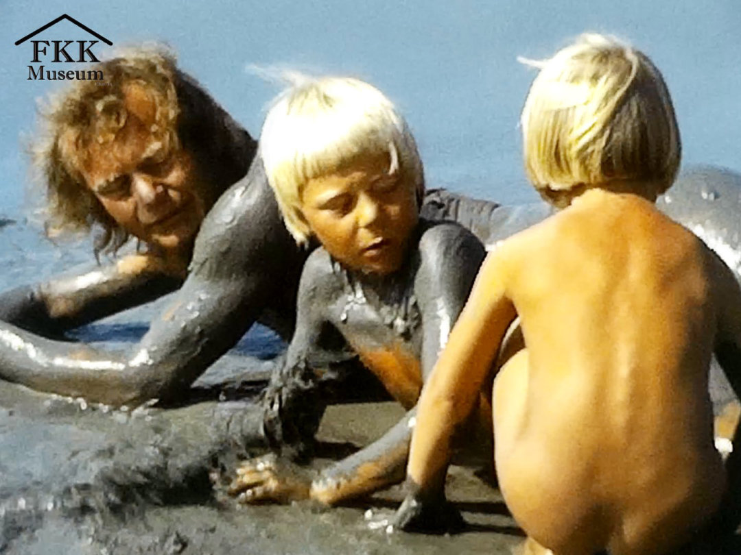 und Erhard Hagebeuker (ehemaliger Bundesvorsitzender der fkk-jugend e.V.) mit ihren Kindern bei der Körperbemalung mit Tonschlick und Sand im Centre