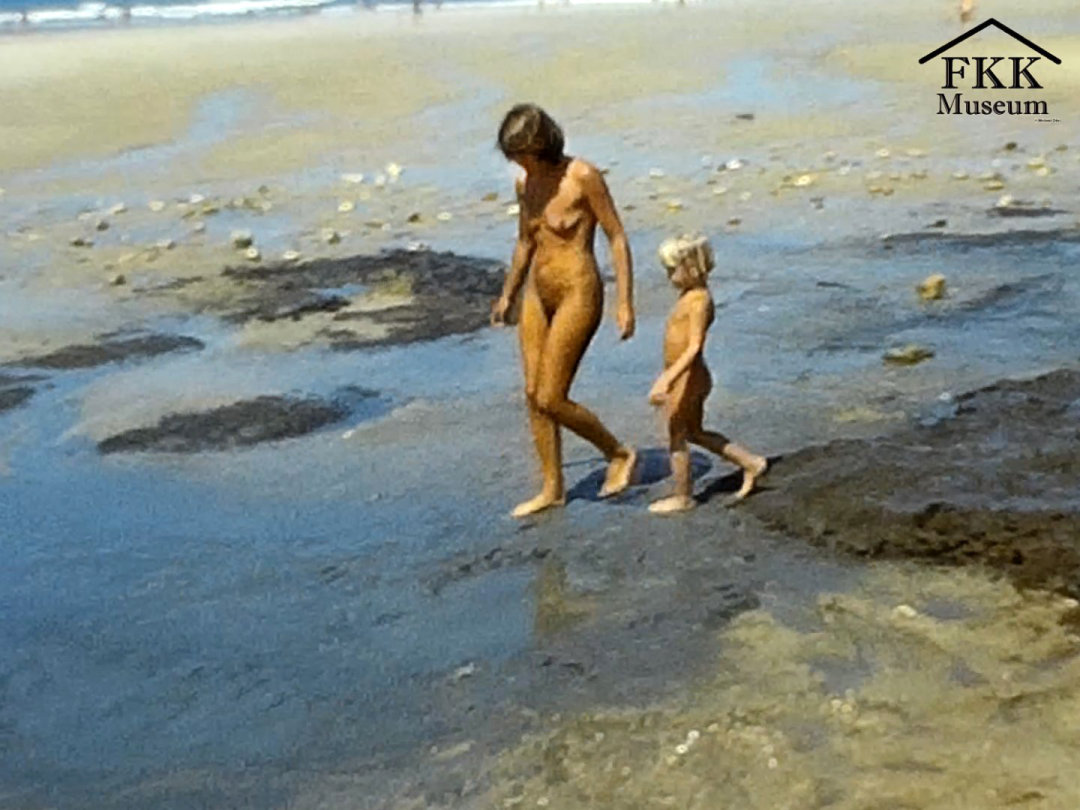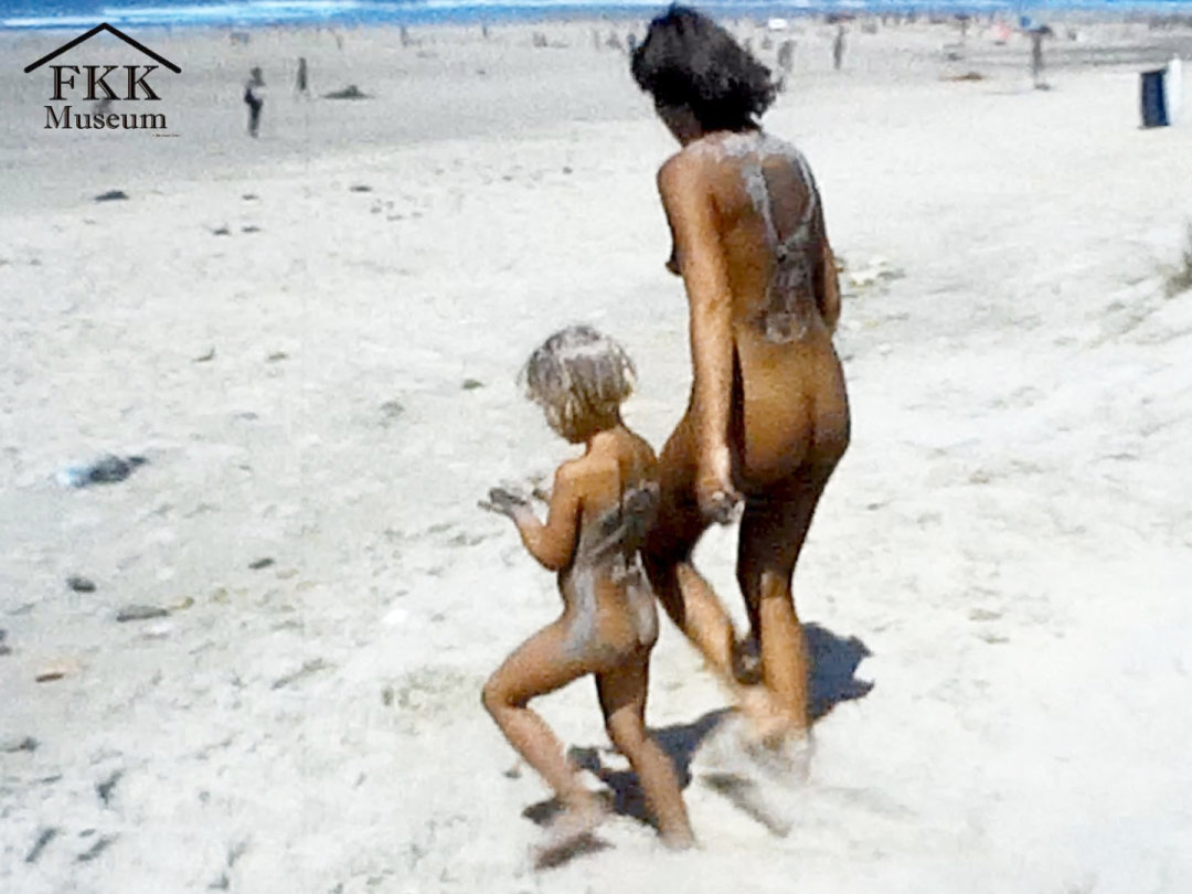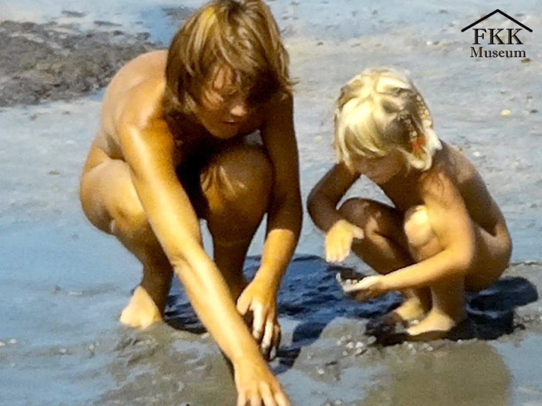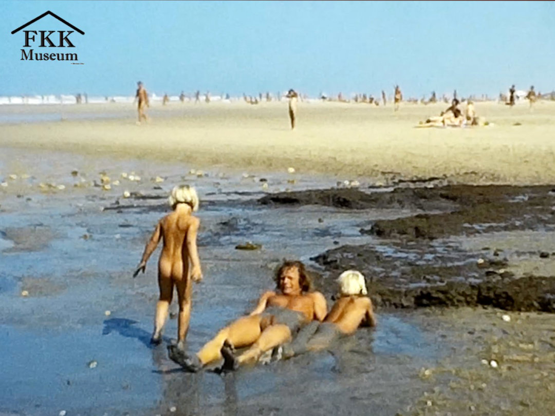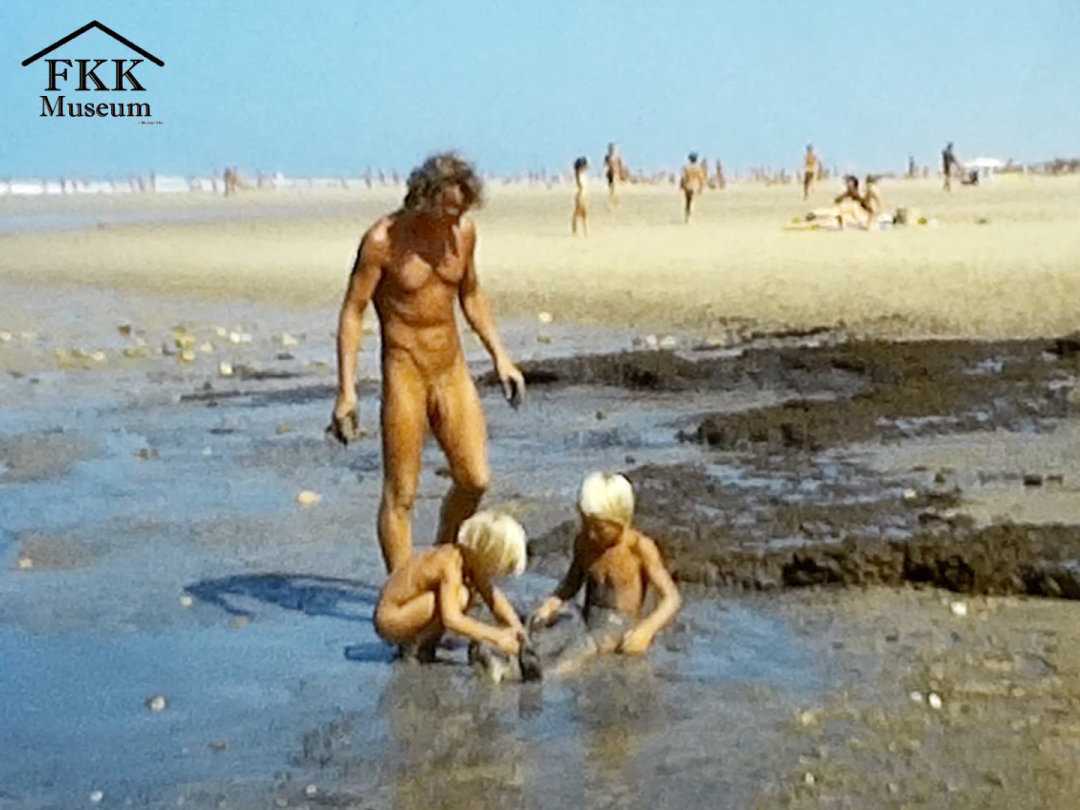 und Erhard Hagebeuker (ehemaliger Bundesvorsitzender der fkk-jugend e.V.) mit ihren Kindern bei der Körperbemalung mit Tonschlick und Sand im Centre