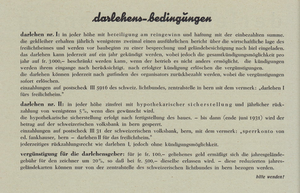 Ein Formular zur Gewährung eines Darlehens war diesem Heft beigelegt. Mit dem Darlehen sollten genügend Geldmittel zusammenkommen, um den Bau eines Vereins- heimes (Freilichtheim) zu finanzieren. |