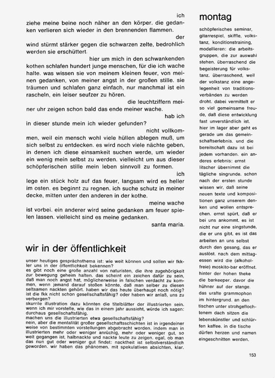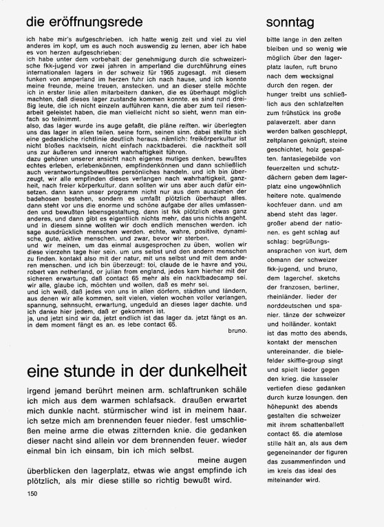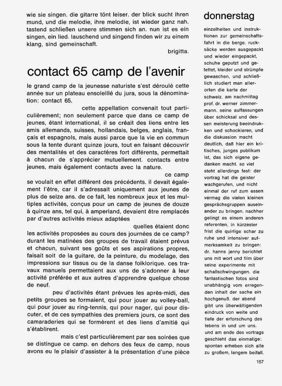 Bis auf vier Seiten wurde dieses Heft in dem Bild- wie auch in dem Textteil von der fkk-jugend gestaltet. Grund hierfür war das internationale Jugendtreffen »contact 65« in der Schweiz. |