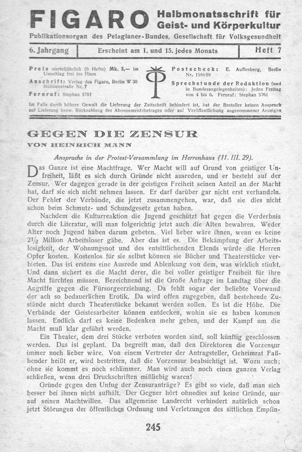 FIGAROHalbmonatsschrift für Geist- und KörperkulturHeft 7 • VI. Jahrgang April - 1929 |