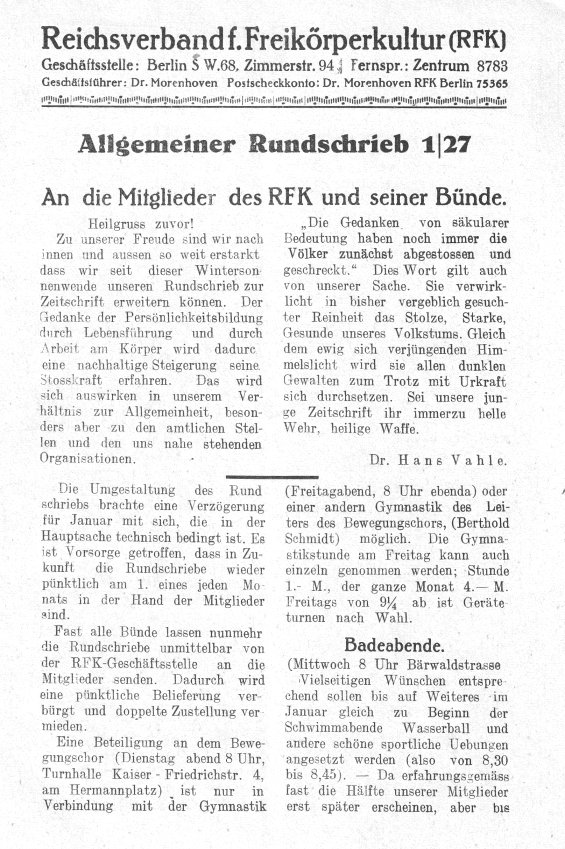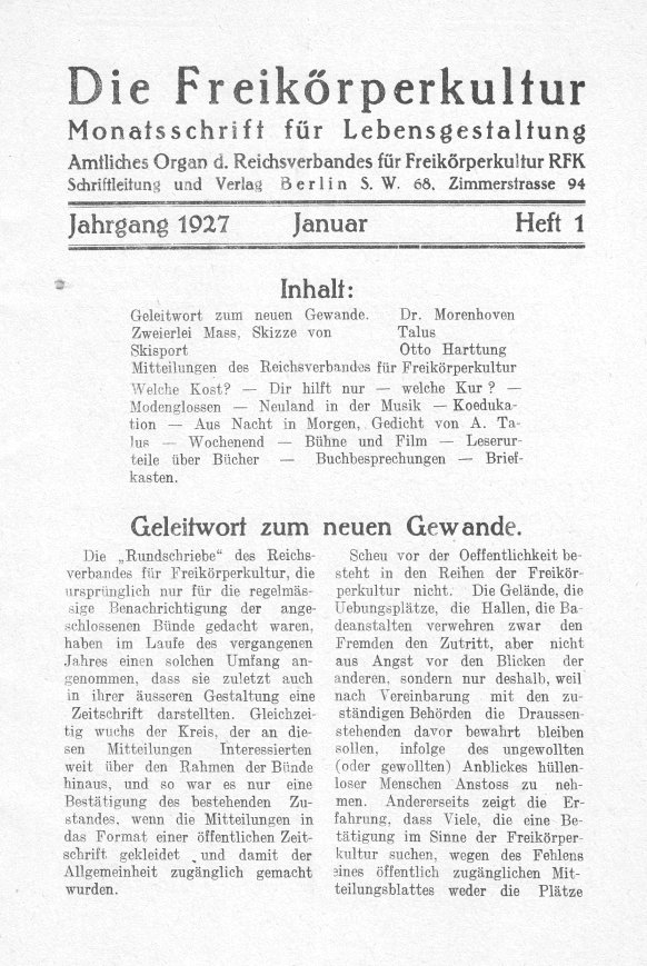 Die FreikörperkulturAmtliches Organ des Reichsverbandes für FreikörperkulturRFK Monatsschrift für Lebensgestaltung Heft 1 • Januar 1927 |