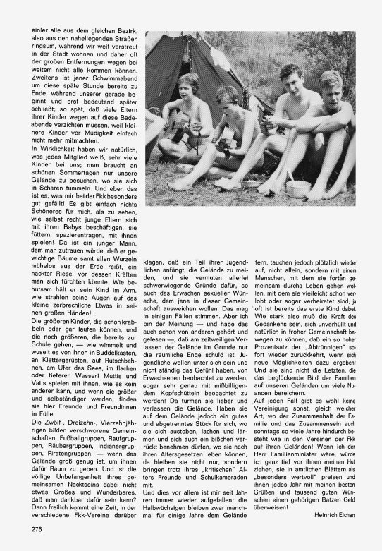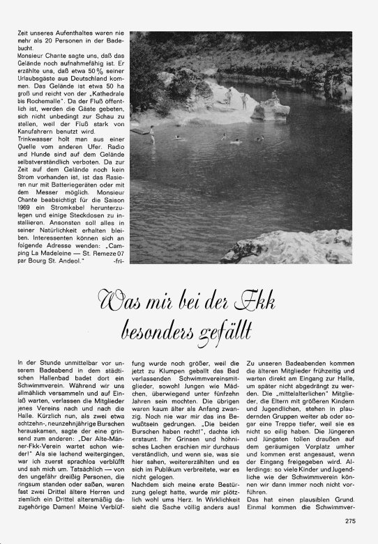 Was mir bei der FKK besonders gefällt Heinrich Eichen berichtet, wie er zur FKK kam und was ihm dabei gefällt: → 1. Seite → 2. Seite Titelbild Momentaufnahme vom FKK-Jugendlager 1968 am Sonnensee, im Foto festgehalten von Franz Trautmann. |