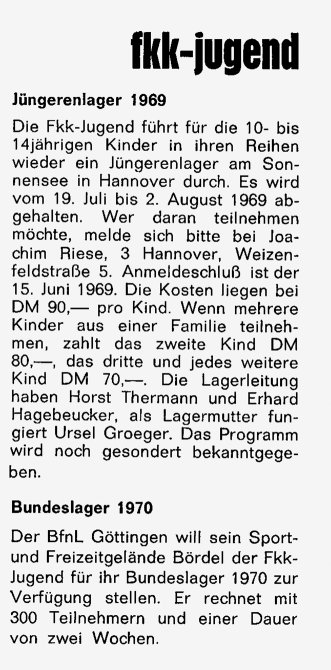 » ... über allem steht der Mensch !« Bericht vom außerordentlichen Bundes- tag des Deutschen Sportbundes: → Seite fkk-jugend Ankündigung zum „Jüngerenlager 1969” und zum „Bundeslager 1970” → Ankündigungen |