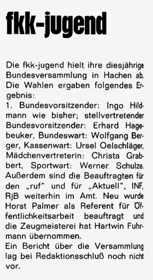 Freizeit - Sport - Camping Verbrauchermesse in München mit einem Stand des LV Bayern. Die Hütte am Forellenteich Bericht über den FKK-Sportpark im Saarland: → Seite → Fortsetzung fkk-jugend Kurzbericht über das Wahlergebnis der Bundesversammlung in Hachen: → Ankündigungen |