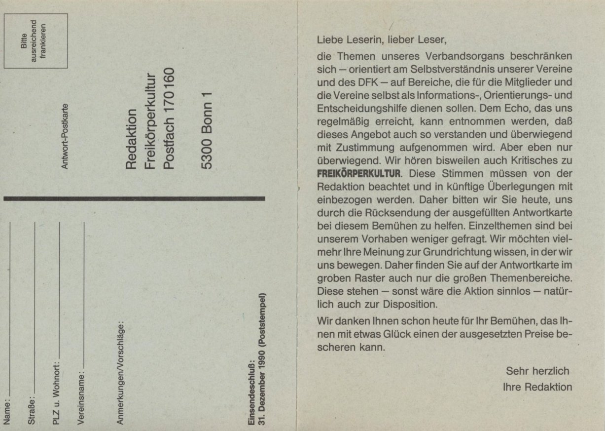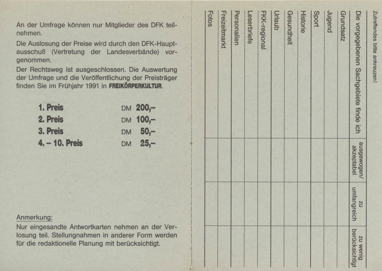 Umfrage der Mitglieder zu ihrer Einschätzung und Zufriedenheit mit dem Verbandsorgan „Freikörperkultur”.