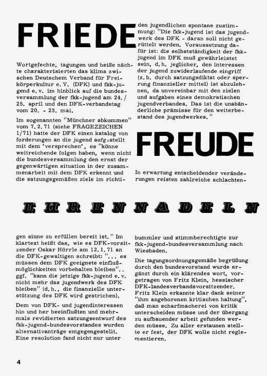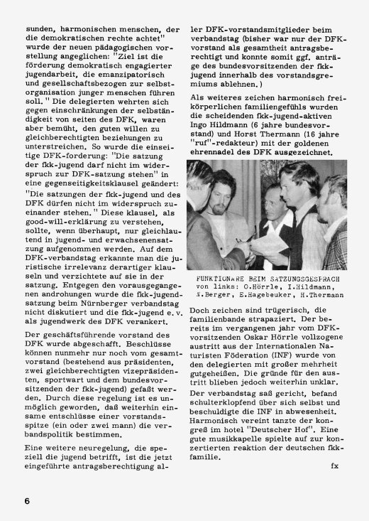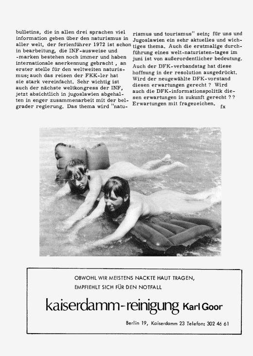 Fragezeichen Fragezeichen ist eine Zeitschrift der fkk-jugend Ausgabe 2 - 1971 Redaktion:Ort:Verantwortung:Herausgeber:Erscheinungsweise:Format:Seiten:Auflage:Titelbild: fkk-jugendBielefeldFritz BollnowFrank Bielka~14,7 x 20,7 cm52- keine Angabe -Michael Röhr Seitenbeispiele: Inhalt: Inhalt / Impressum Friede Freude sport und politik Wie progressiv ist die fkk-jugend ? am deutschen wesen soll die inf genesen INF contra DFK 1. naturisten-welttag → 20. Juni 1971 es stellt sich vor: Fritz Bollnow, beisitzer im bundesvorstand Ferien vom Ich - Osterskilager 71 Buäääh contra Bla-Bla auf der (mittelberg-)alm, da gibt's ka..... Ö,ffentlicher FKK-Strand in Berlin Comic FKK an der Havel News Wie schön ist's funktionär zu sein bisher unveröffentlichte schätze aus dem »ruf«-nachlaß versackt / Bindestrich Der Mey der Mey Und immer wieder Summerhill der ruf / junge linke