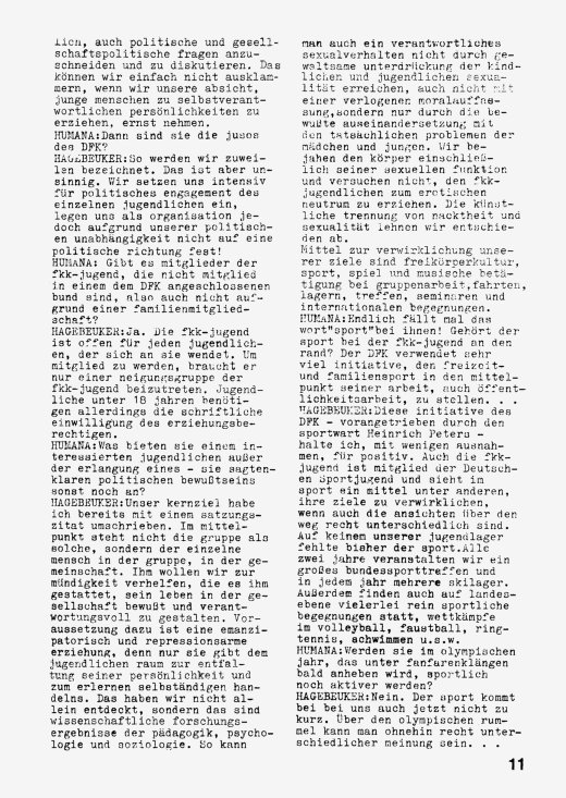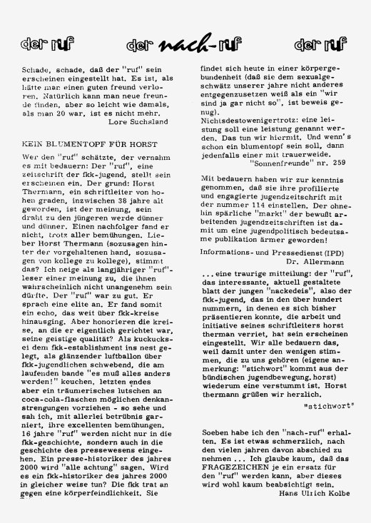 Fragezeichen Fragezeichen ist eine Zeitschrift der fkk-jugend Ausgabe 3-4 - 1971 Redaktion:Ort:Verantwortung:Herausgeber:Erscheinungsweise:Format:Seiten:Auflage:Titelbild: fkk-jugendBielefeldSigrid BanzhafHorst Palmer~14,7 x 20,7 cm56- keine Angabe -Rolf Tilmani-Vincent Seitenbeispiele: Inhalt: an unsere leser / an das publikum Inhalt / Impressum an uns über uns der nach-ruf es stellt sich vor: bundesvorsitzender Erhard Hagebeuker Oskar Hörrle verschenkt 16000 Mark Kriegsdienstverweigerung Heliozoen am Sonnensee: beispiel vorbildlicher jugendarbeit jugendcamp '70 Teen Treff 71 • corona, dänemark - Résumé eines Jugendlagers (Selbst)Kritik als Schwarzmacher oder als Anregung zum Verbessern? Spiel ohne Grenzen ZON-(lager) Zeitung Ohne Namen Westdeutsche Jungnackte verunsichern Dänemark oder die Bunte Zelle des DFK Kommentar zu teen-treff 71 Lagerkonzeption „Teen-Treff 71” Diskussionsgrundlage der pädagogischen konzeption der fkk-jugend aufgrund der erfahrungen von teen-treff '71 was ein kind gesagt bekommt Ehrenratsverfahren LV NRW gegen Lagerleitung Tee-Treff '71 ist der cvjm-hamburg des teufels, oder ist er ganz einfach vernünftig bisher unveröffentlichte schätze aus dem »ruf«-nachlaß Bindestrich / Briefe, die man oft verschickt §218 oder die unmündigkeit der frau BffL Hannover - pro + contra News