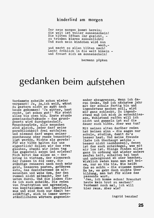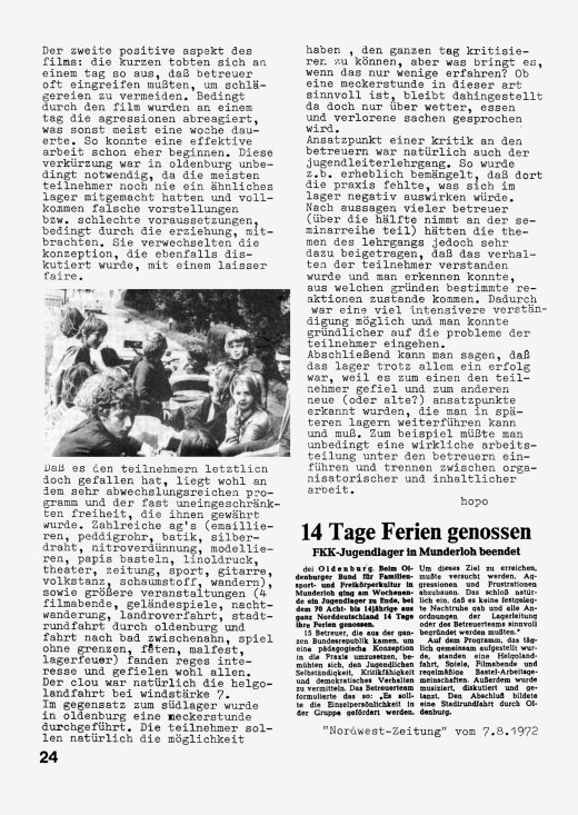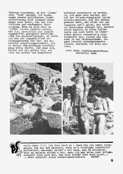 Fragezeichen Fragezeichen ist eine Zeitschrift der fkk-jugend Ausgabe 3-4 - 1972 Redaktion:Ort:Verantwortung:Herausgeber:Erscheinungsweise:Format:Seiten:Auflage:Titelbild: fkk-jugendBielefeldIngrid BanzhafHorst Palmer~14,7 x 20,7 cm56- keine Angabe -Michael Röhr Seitenbeispiele: Inhalt: an unsere leser Inhalt / Impressum Fragezeichen Leserbefragung meine antwort auf den nachruf des bundesvorstandes der fkk-jugend für hans surén fkk-jugend kontra DFK - Kritik an Heinrich Peters Artikel Der Rückzug in die Ideologien Jugendarbeit am Beispiel: Mehr als ein Modellfall ? Sind wir radikal ? FKK Ferien Paradiese Permeet '72 Permeet '72 oder: beim nächsten Mal mit Vorsischt zu geniessen Jugendlager Nord in Oldenburg kinderlied am morgen / gedanken beim aufstehen fkk-jugend e.V. → Offener Brief A ... wie Anfang → Comic jeder hat das recht ... eine zensur findet nicht statt ... hört die stimme eures herrn ! Bindestrich Briefe, die man nicht nur anonym verschickt das „kleinere übel” hat gesegt. ist es das „kleinere übel”? Die vorweihnachtliche Überraschung Wahl 73 Schwarzbuch: Franz Josef Strauss bisher unveröffentlichte schätze aus dem »ruf«-nachlaß: News Solidarität mit Günter Amendt Schattenkinder Gerda Thermann Nebensache