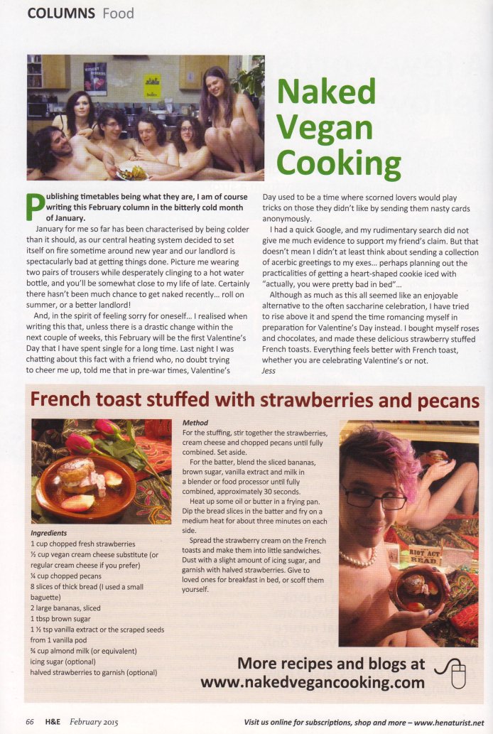 Rezept in dieser Ausgabe: French toast stuffed with strawberries and pecans (Französischer Toast, gefüllt mit Erdbeeren und Pekannüssen) Naturism at Home Artikel über die positiven Aspekte des heimischen Naturismus. Es wird dabei der Frage nachgegangen, warum es auch praktisch ist, textilfrei in den eigenen vier Wänden zu sein - und nicht nur im Urlaub oder im Verein. |