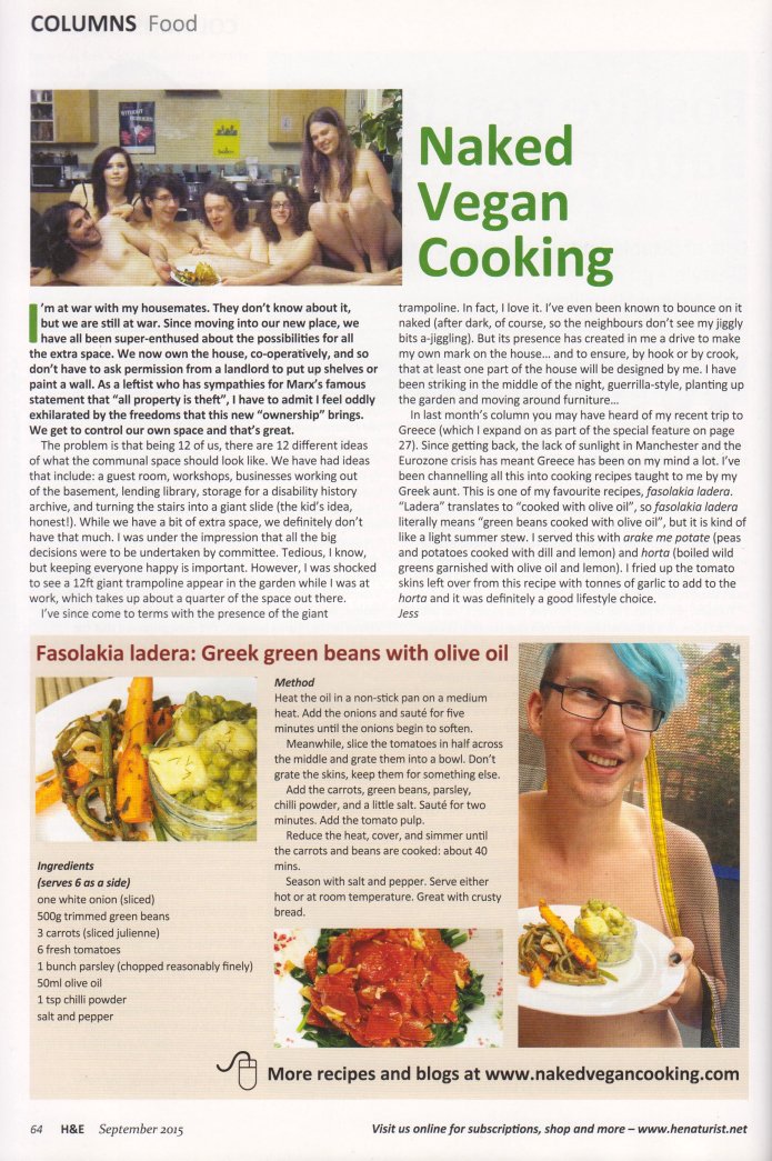 | Naked Vegan Cooking Rezept in dieser Ausgabe: Fasolakia ladera: Greek green beans with olive oil Schwerpunkt-Thema: Griechenland Land und Leute, Sehenswürdigkeiten und Naturismus The single naturist: an experiment Mark Taylor testet Reiseveranstalter darauf, wie die Reise-Veranstalter reagieren, wenn man als männlicher Single einen Naturisten-Urlaub zu buchen versucht, wie zum Beispiel in einem Family-Resort. |