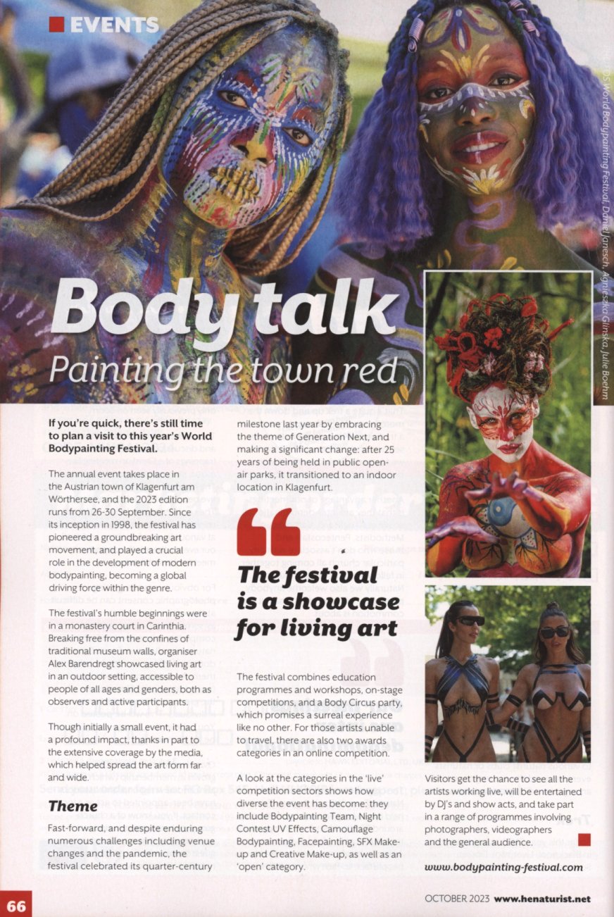 | Das Titelbild stammt vom Body Painting Festival in Klagenfurt am Wörthersee. Dieses farbenfrohe Event fand vom 26. bis 30. September 2023 statt. Erstmalig wurde es im Jahr 1998 durchgeführt und ist nicht nur unteer Naturisten sehr beliebt. www.bodypainting-festival.com |