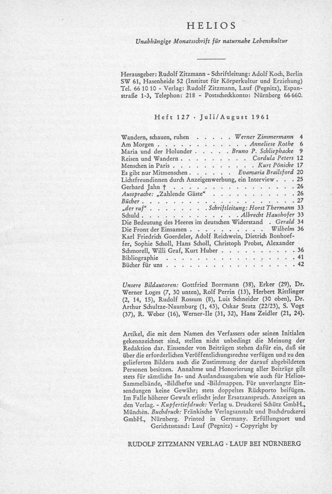 HELIOSUnabhängige Monatsschrift für naturnahe LebenskulturHeft 127 • Juli / August 1961 Doppelausgabe |