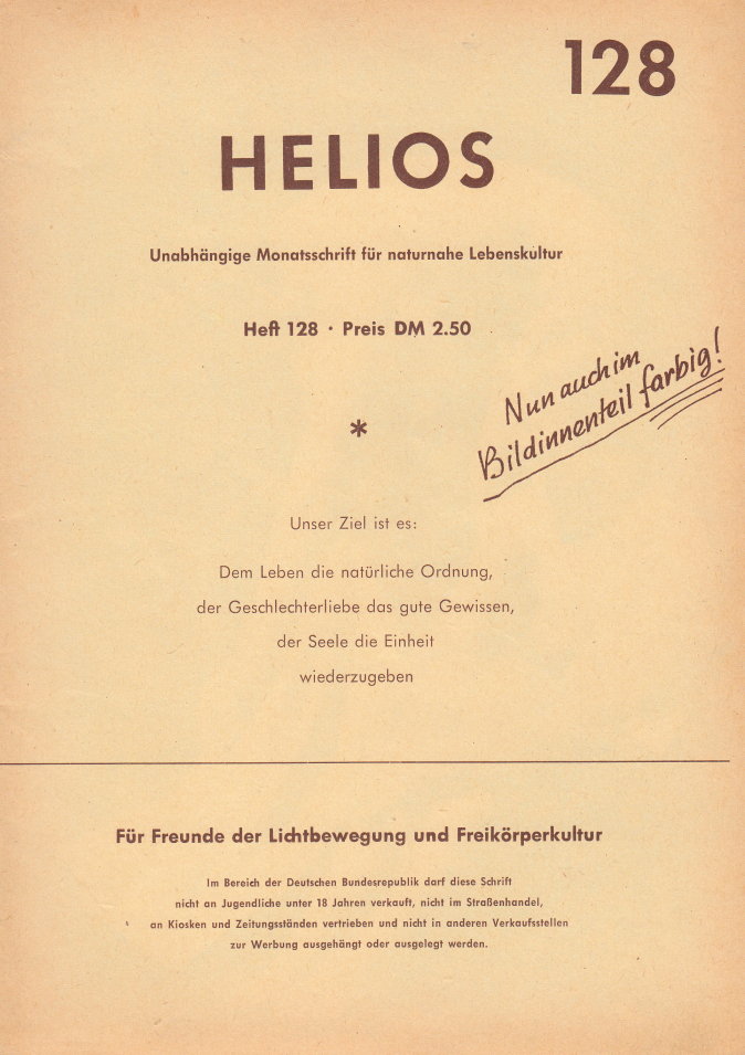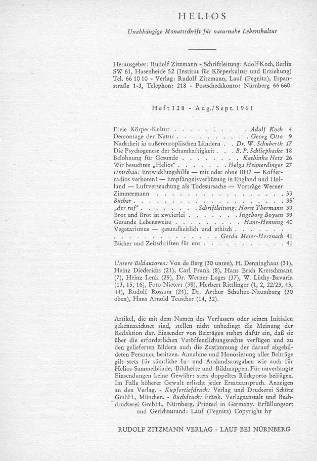 HELIOSUnabhängige Monatsschrift für naturnahe LebenskulturHeft 128 • August / September 1961 Doppelausgabe |