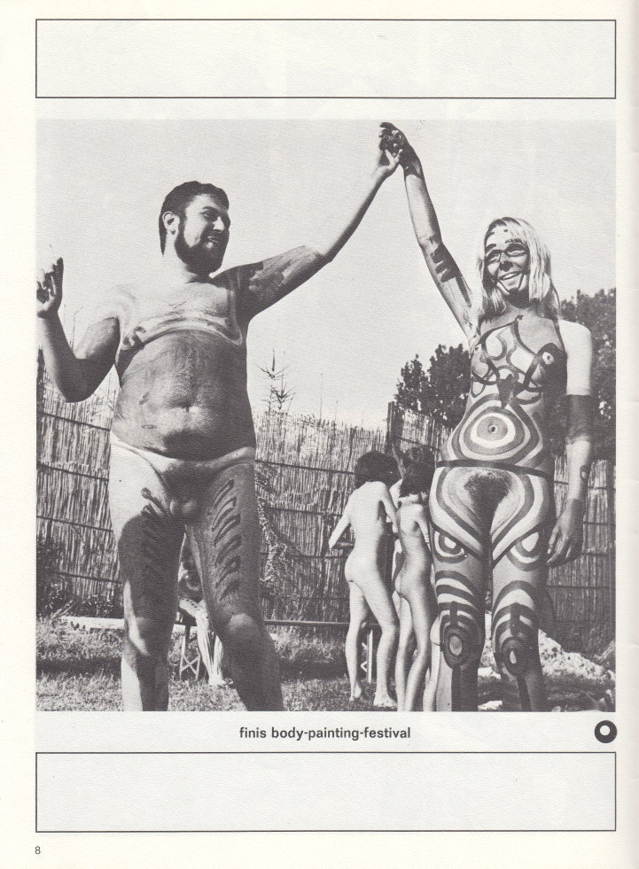 | body-painting-happening der fkk-jugend Das Bild zeigt den späteren Bundesvorsitzenden der fkk-jugend e.V. Erhard Hagebeuker auf dem Teen-Treff '70, wie er gerade von seiner Frau Ursel küstlerisch „verziert” wird. |
