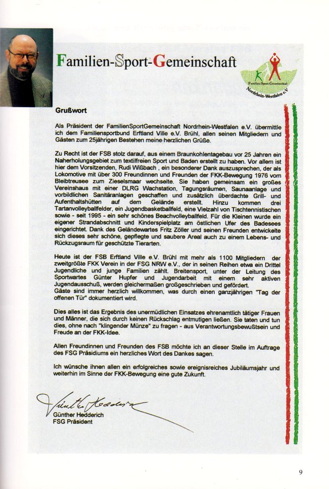 Grußworte von Dr. Franz-Josef Antwerpes (Regierungspräsident von Köln), Wolfgang Bell (Landrat des Erftkreises), Peter Müller (Bürgermeister), Detlef Schrader (DFK-Präsident), Günther Hedderich (FSG Präsident) und vielen weiteren, befinden sich im ersten Teil dieses Heftes. Es folgt die Geschichte des Vereines und zahlreiche Geschichten und Anekdoten, an die sich die Mitglieder sicherlich gerne zurück erinnern - in erster Linie, die älteren Mitglieder.