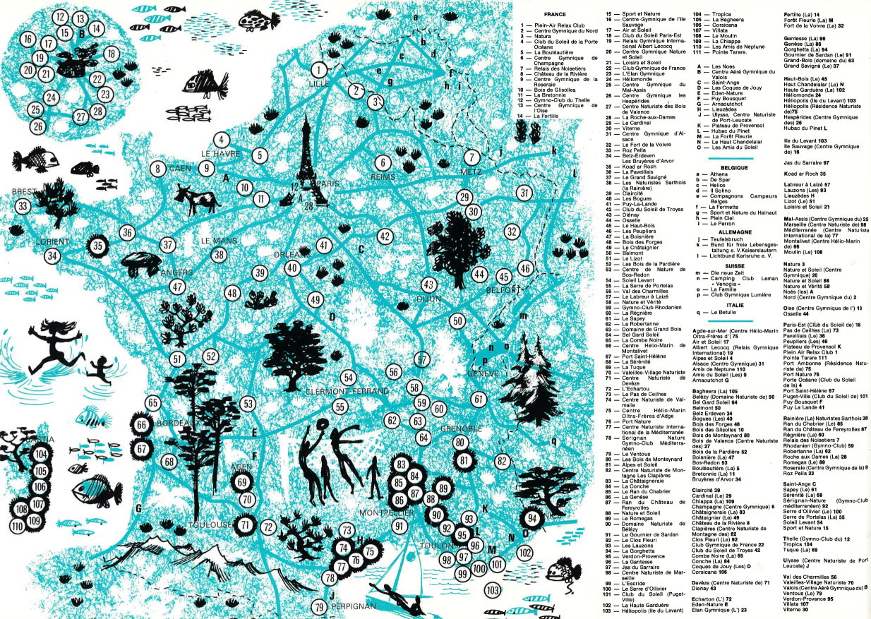 Mit einer doppelseitigen Übersicht der 125 FKK-Möglichkeiten mit Stand: März 1974, in Frankreich, jeweils mit detaillierten Beschreibungen auf den nachfolgenden Seiten. |