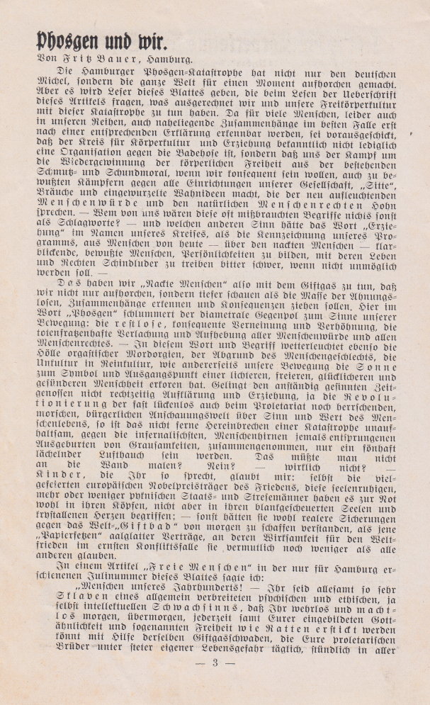 | Anmerkung: ... zu dem Artikel „Phosgen und wir” (Seite 3 bis 5) Phosgen ist ein sehr giftiges Gas und wurde als chemischer Gaskampfstoff militärisch im ersten Weltkrieg eingesetzt. Am 20. Mai 1928 trat aus einem undichten Kesselwagen auf dem Gelände der Chemischen Fabrik Stoltzenberg (Hamburg) über 10.000 Liter Phosgen aus. Es entstand eine Giftgaswolke, welche sich über den Müggenburger Kanal, dann Richtung Wilhelmsburg, Georgswerder und Harburg ausbreitete. Mindestens 16 Menschen starben (1) bei diesem Unglück und über 300 Menschen erkrankten mit schwersten Schädigungen der Lunge. Das Phosgen (Kampfmittelbestand aus dem 1. Weltkrieg) wurde bei der Fa. Stoltzenberg zwischengelagert und sollte zur Vernichtung weiter befördert werden. (1) → Angabe der Todesopfer: Antwort auf die Eingabe von Dr. Engels und Dr. Linshöfts an den Hamburger Senat vom 12. Mai 1933. SA-HH: 131-4, 1928 A59/5. (Hinweis wegen abweichender Zahlen in anderen Quellen) |
